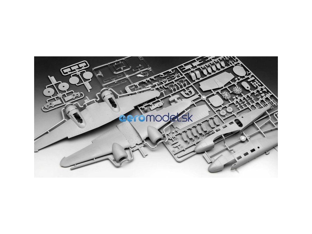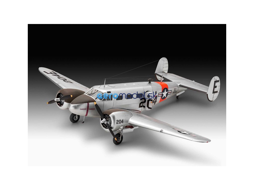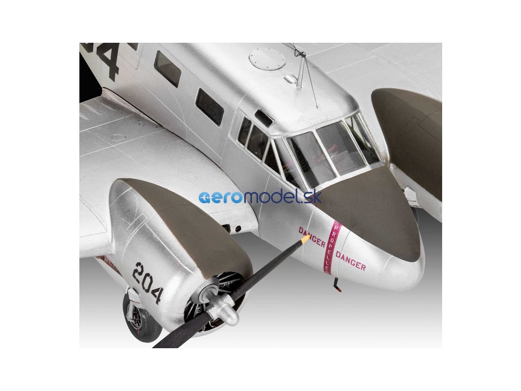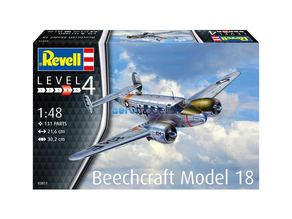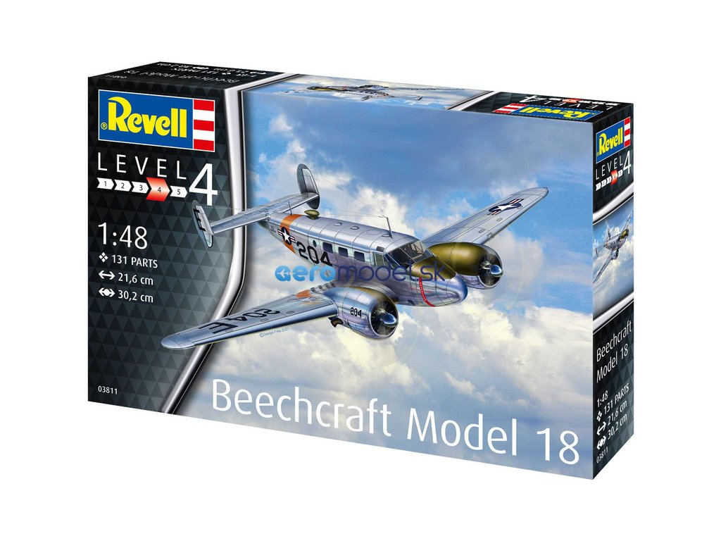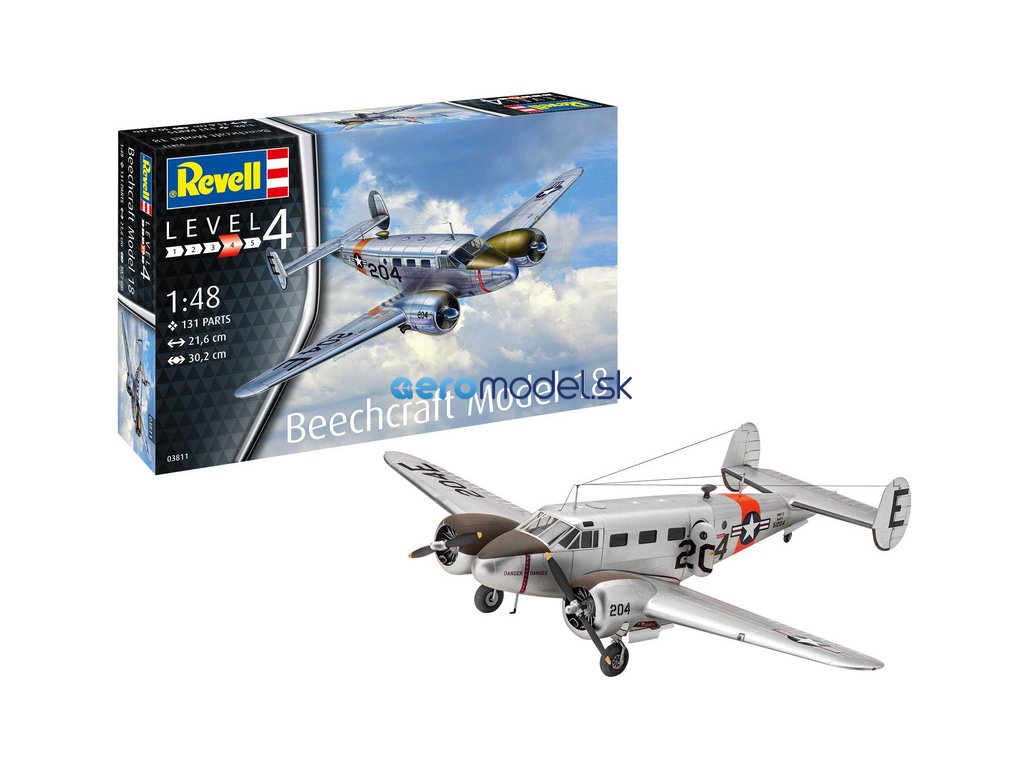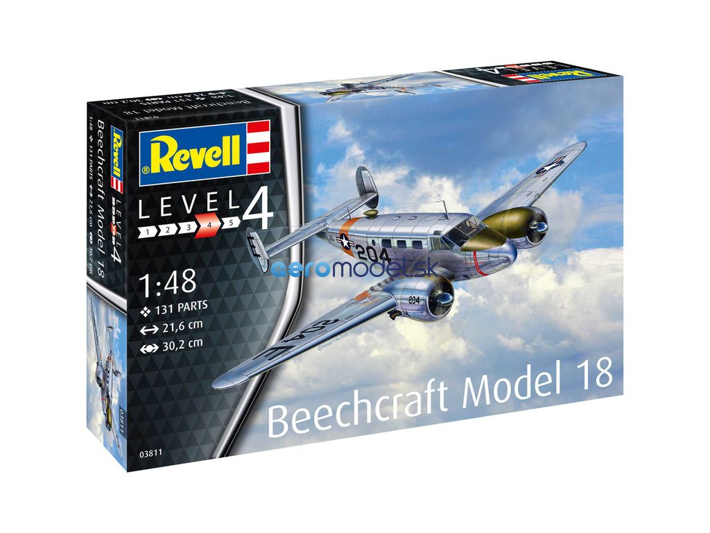 Plastikový model Revell 03811 – letadlo Beechcraft Model 18 v měřítku 1:48 ke slepení. Stavebnice obsahuje 129 dílků, rozpětí křídel 302 mm, obtížnost 4.