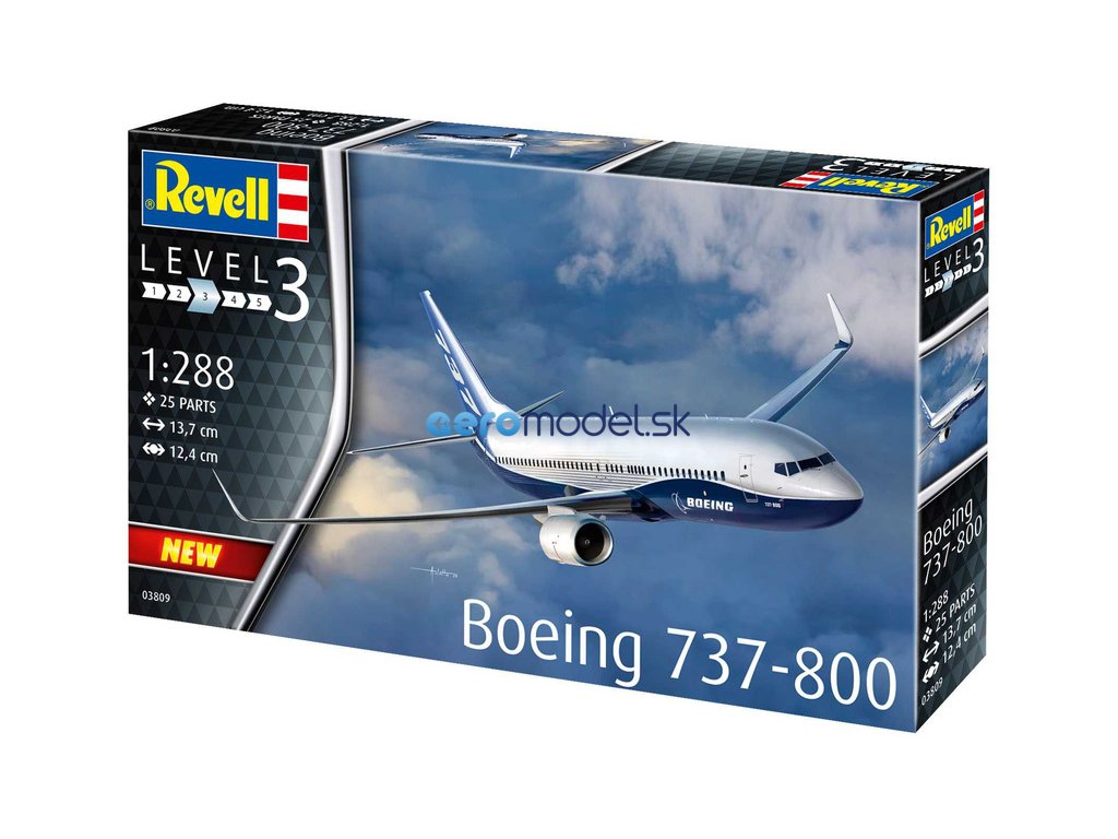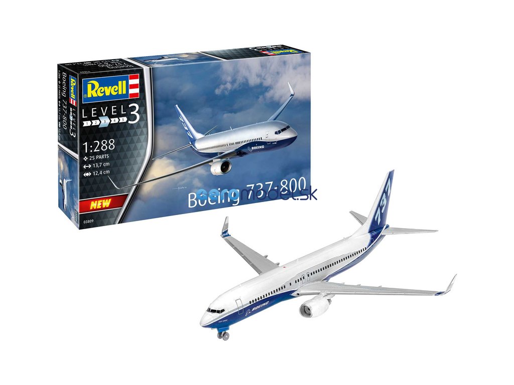 Plastikový model Revell 63809 - letadlo Boeing 737-800 v měřítku 1:288 ke slepení. Sada obsahuje 25 dílků, délka 137 mm, obtížnost 3.
