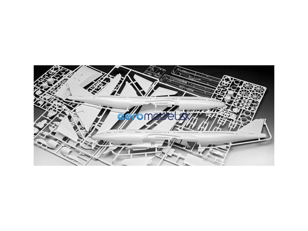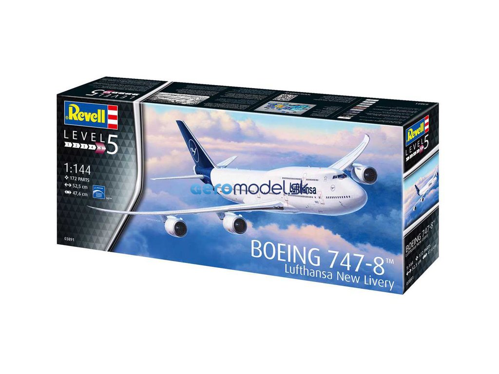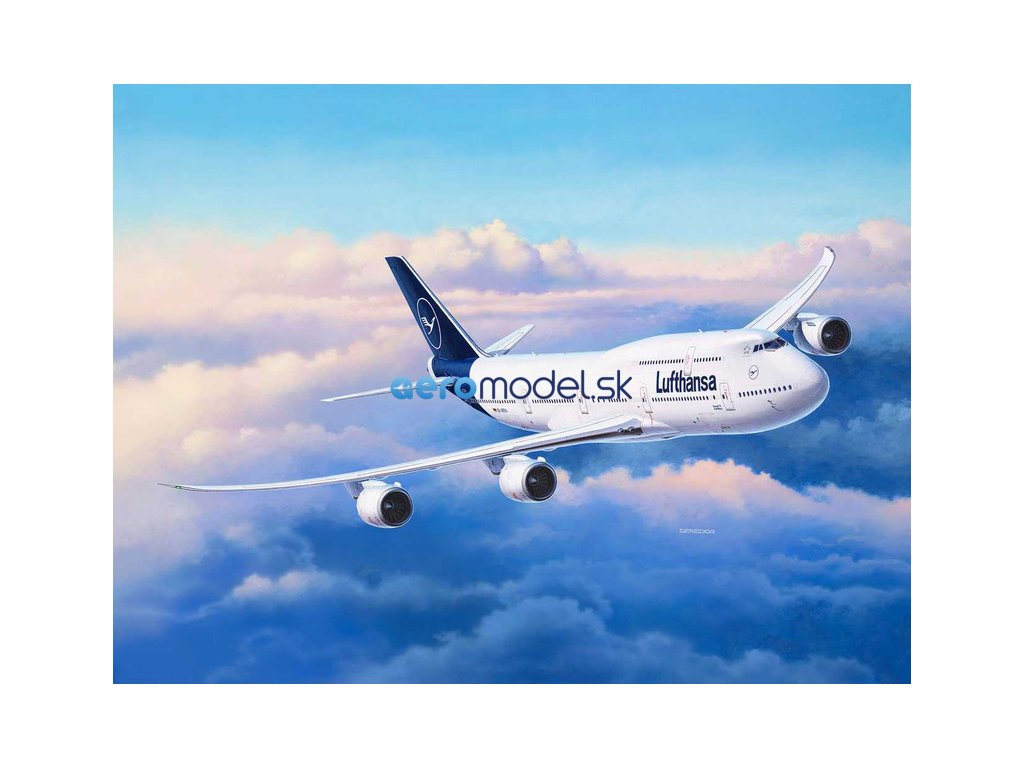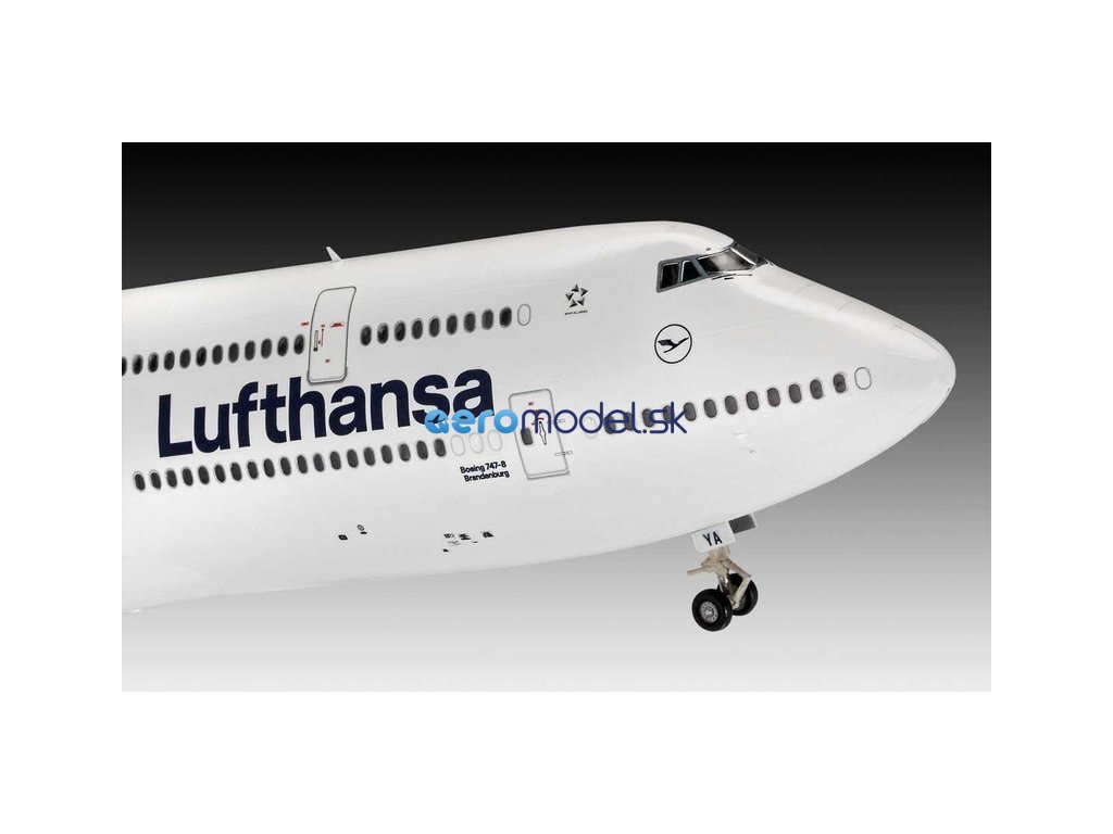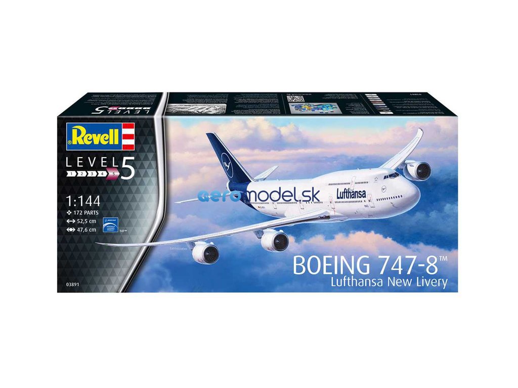 Plastikový model Revell 03891 - Boeing 747-8 Lufthansa New Livery v mierke 1:144 na zlepenie. Stavebnica obsahuje 172 dielov, rozpätie krídla 476 mm, obtiažnosť 5.