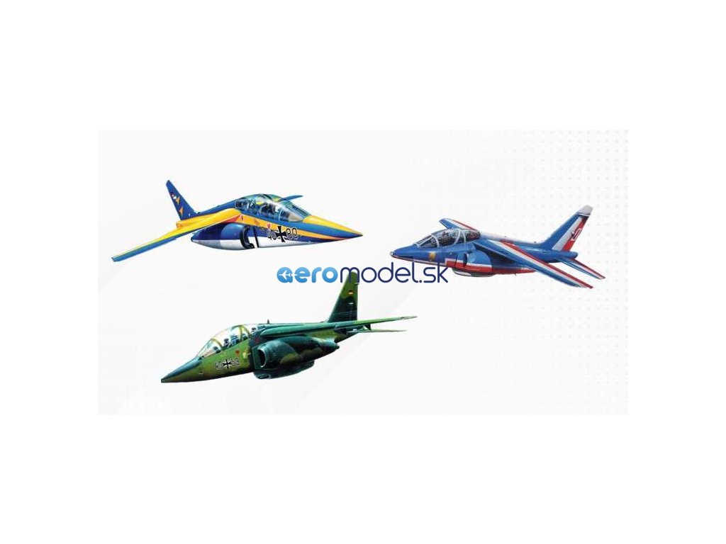 Sada plastikových modelů Revell 03810 - letadla Dassault Alpha Jet 50. výročí v měřítku 1:144 ke slepení. Stavebnice obsahuje 126 dílků, délka 85 mm, obtížnost 3.