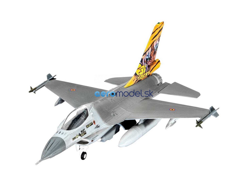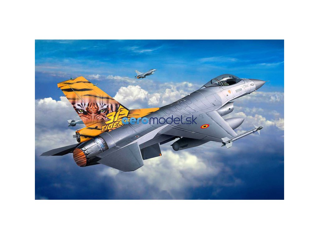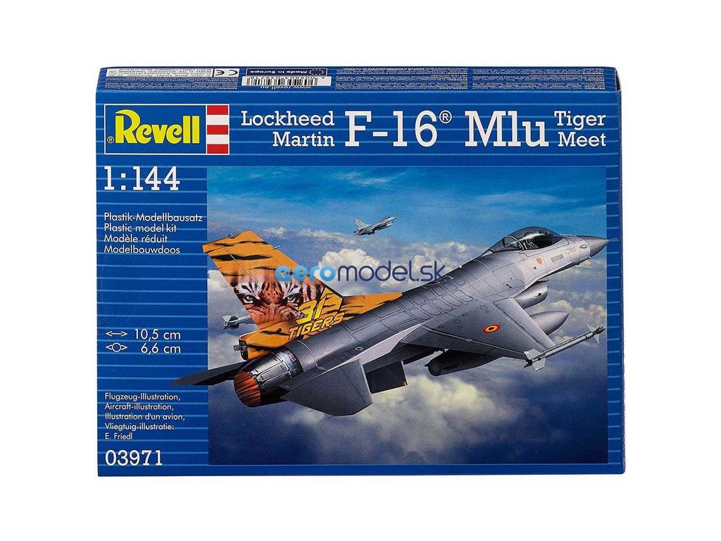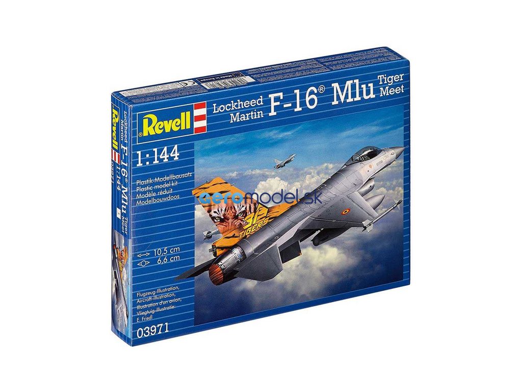 Plastikový model Revell 03971 nejúspěšnějšího bojového letounu F-16 Mlu TigerMeet ke slepení. Meřítko 1:144; délka 10,5 cm, rozpětí křídel 6,6 cm, obtížnost 3. Balení obsahuje 68 dílků ke slepení.
