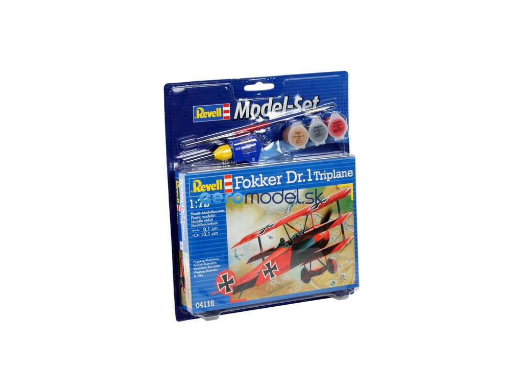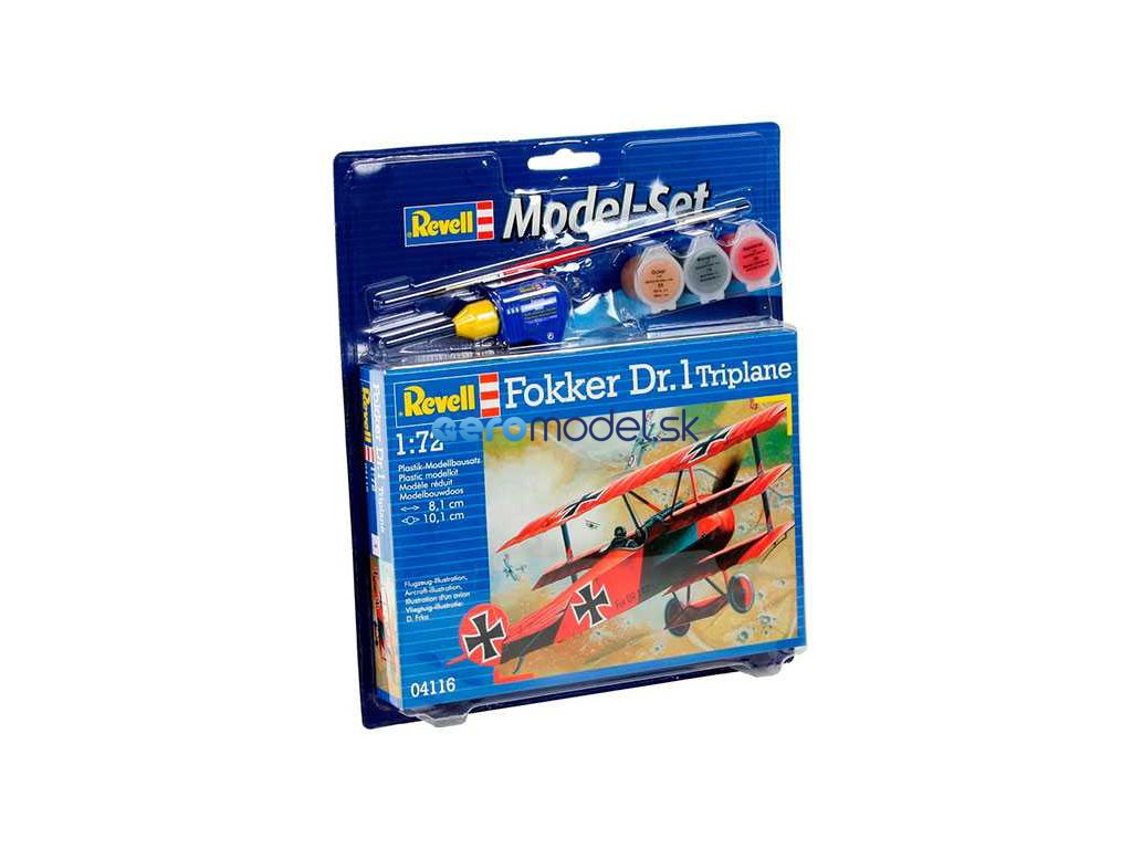 Plastikový model Revell 64116 - FOKKER DR.1Triplane v mierke 1:72 na zlepenie. Stavebnica obsahuje 37 dielov, rozpätie krídel 101 mm, obtiažnosť 4.