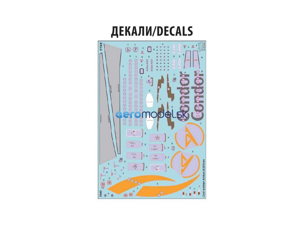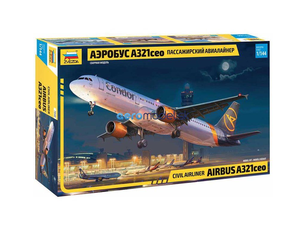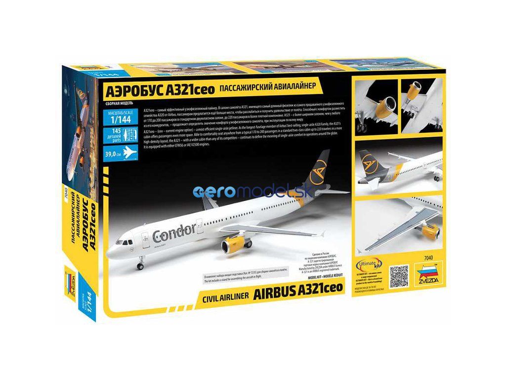 Plastikový model Zvezda 7040 - osobné dopravné lietadlo Airbus A321 CEO v mierke 1:144 na zlepenie. Stavebnica obsahuje 145 dielov, dĺžka 390 mm.