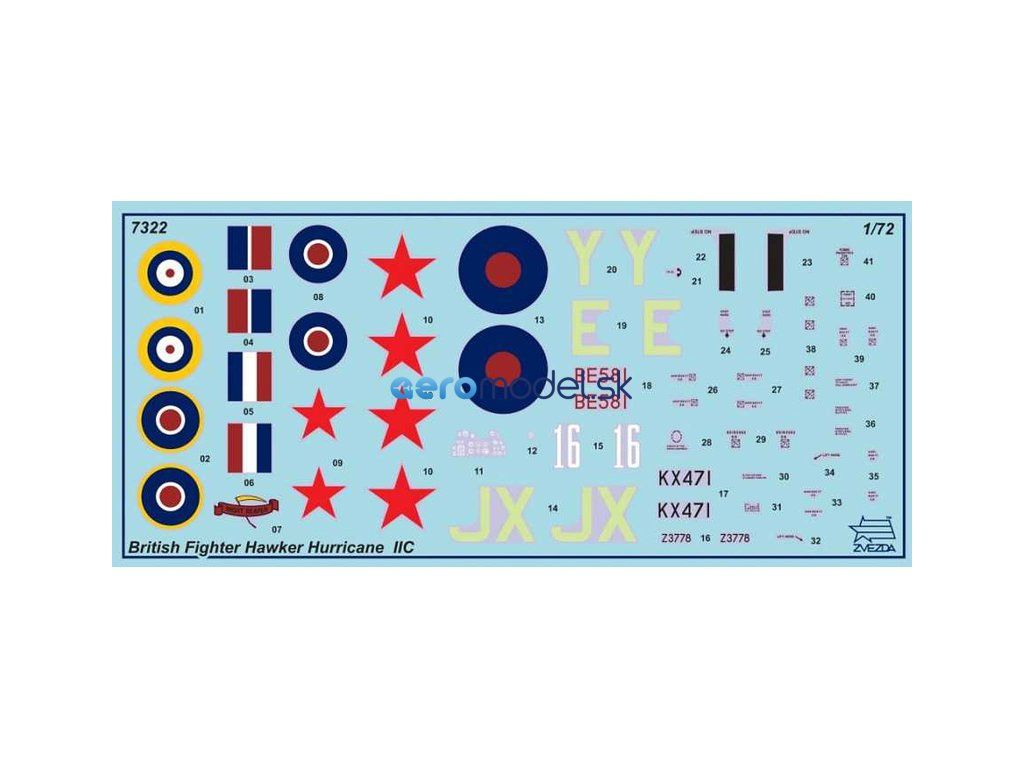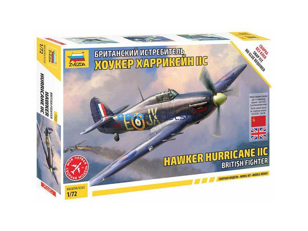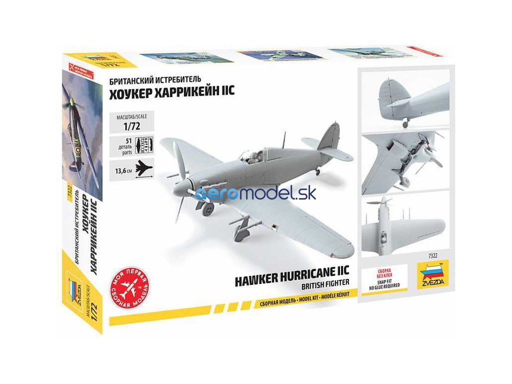 Plastikový model lietadla Zvezda 7322 Hawker Hurricane Mk II C v mierke 1:72 na zlepenie. Stavebnica obsahuje 51 dielov, dĺžka 136 mm.