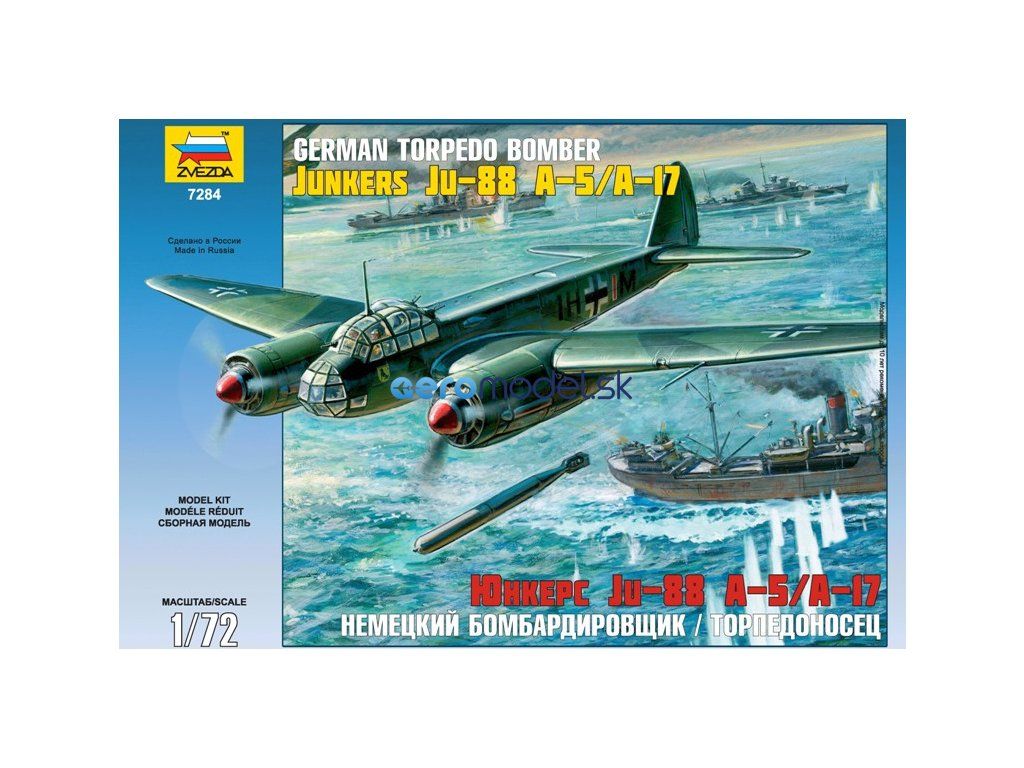 Plastikový model Zvezda 7284 - lietadlo Junkers Ju-88 A-5/A-17 v mierke 1:72 na zlepenie. Stavebnica obsahuje 190 dielov, dĺžka 200 mm.