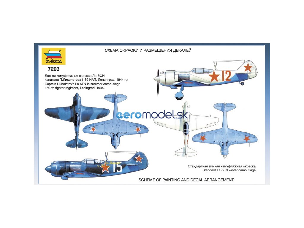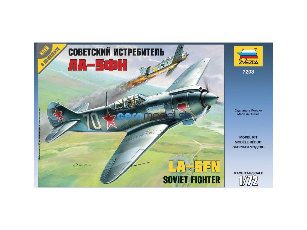 Plastikový model Zvezda 7203 - sovietske lietadlo Lavočkin LA-5 FN v mierke 1:72 na zlepenie. Stavebnica obsahuje 42 dielikov, dĺžka 115 mm, obtiažnosť 3.