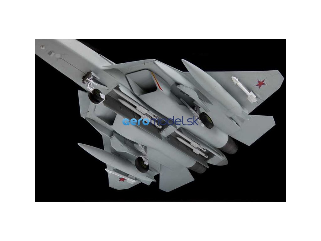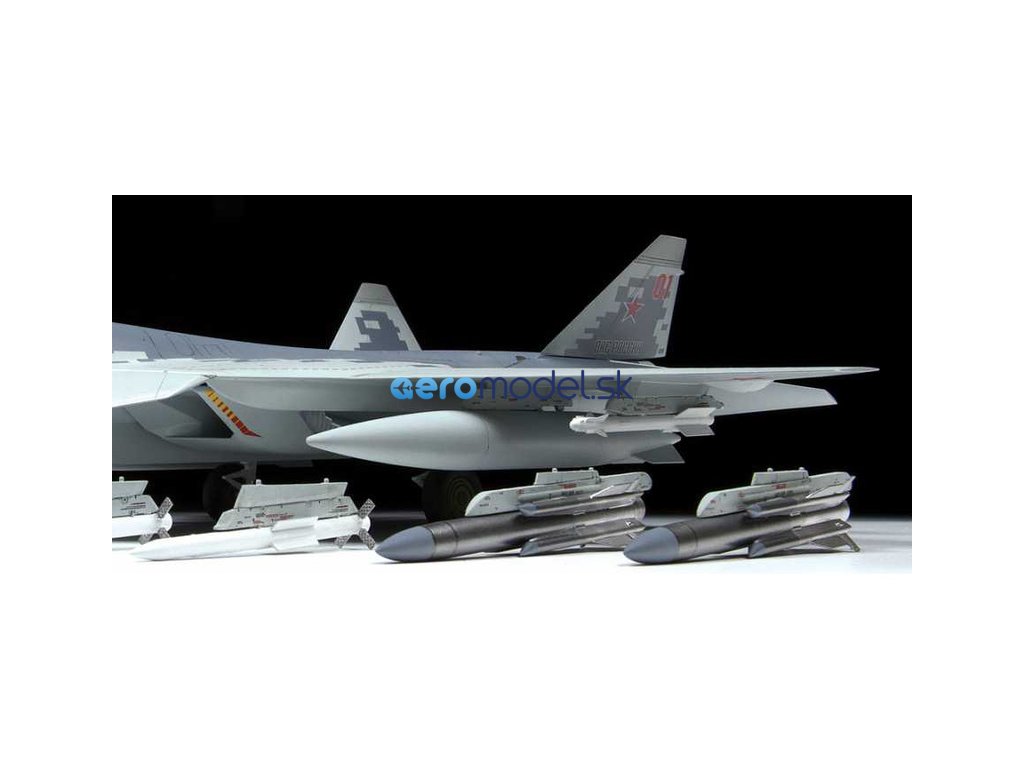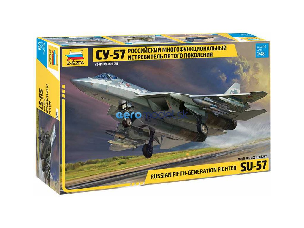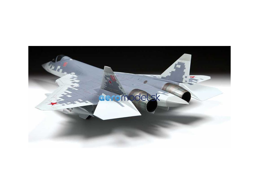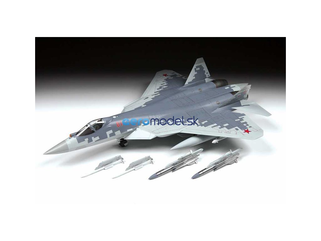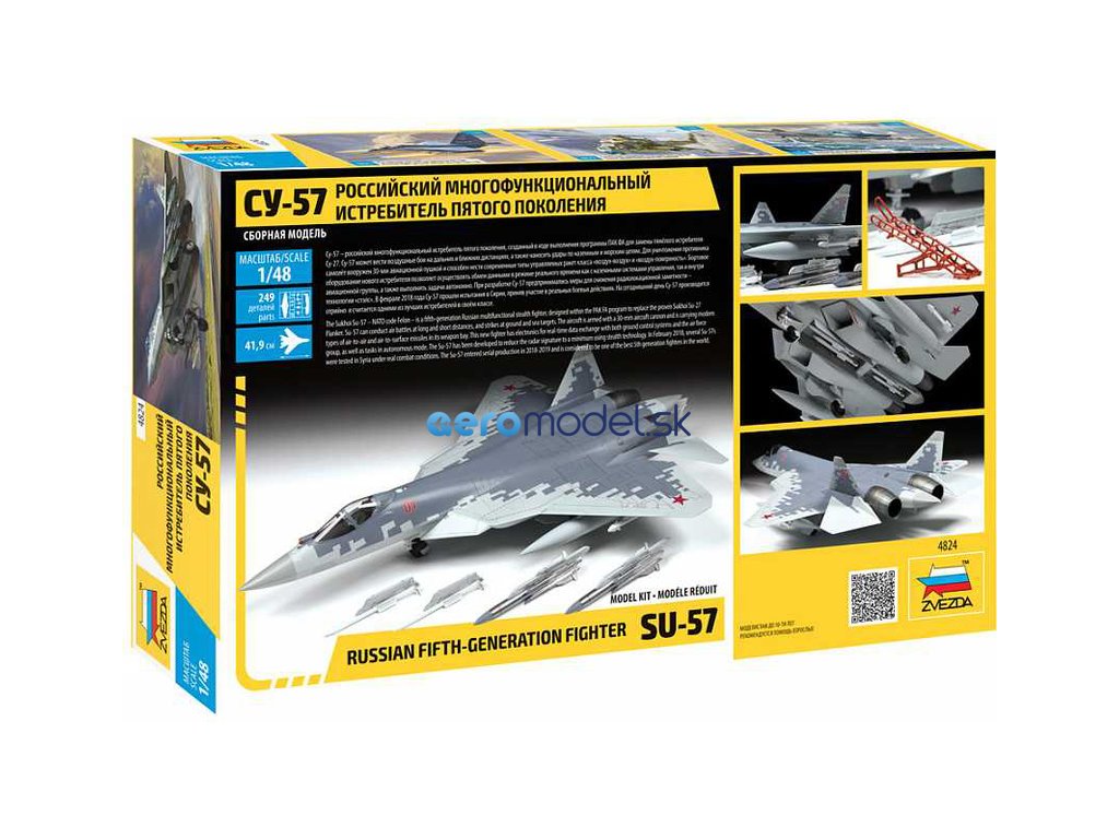 Plastikový model Zvezda 4824 - lietadlo Suchoj Su-57 v mierke 1:48 na zlepenie. Stavebnica obsahuje 249 dielikov, dĺžka 419 mm.