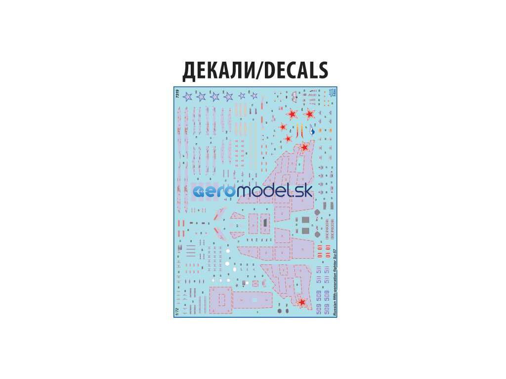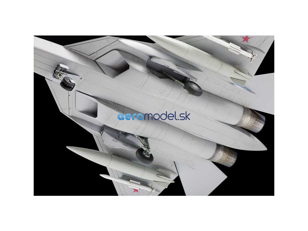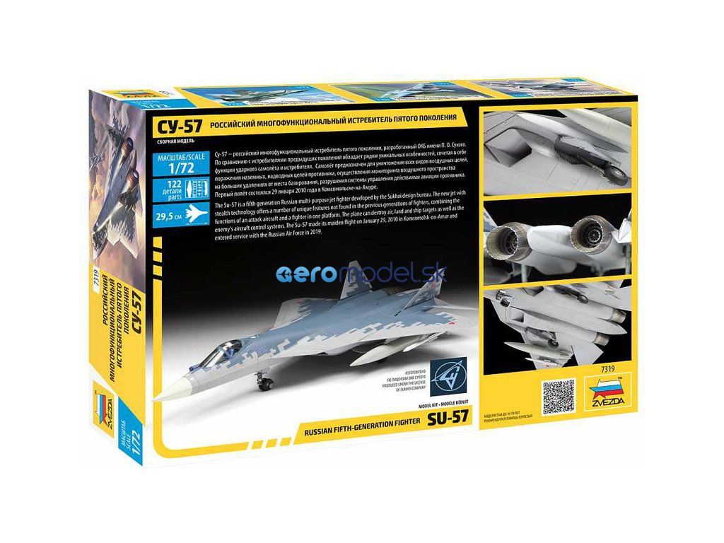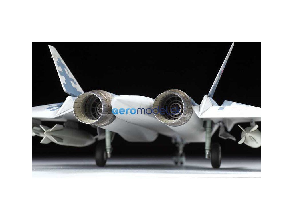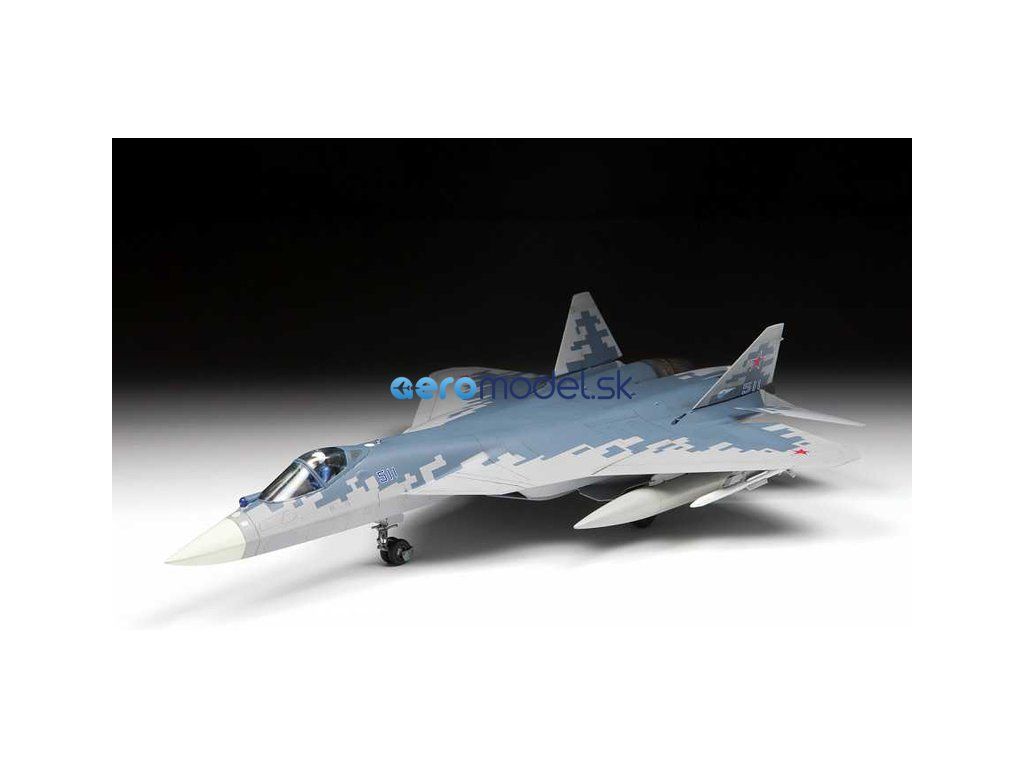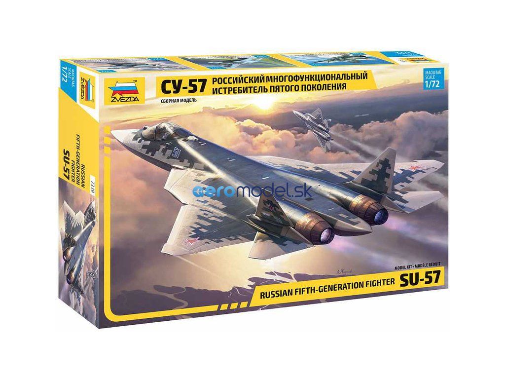 Plastikový model Zvezda 7319 - lietadlo Suchoj SU-57 v mierke 1:72 na zlepenie. Sada obsahuje 122 dielov, dĺžka 295 mm.