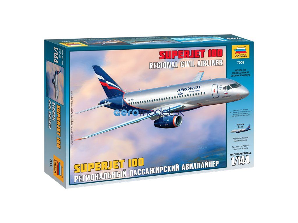 Plastikový model Zvezda 7009 - regionálne dopravné lietadlo Superjet 100 v mierke 1:144 na zlepenie. Stavebnica obsahuje 47 dielov, dĺžka 208 mm.