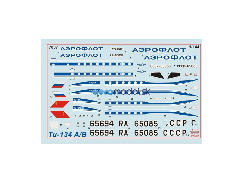 Plastikový model Zvezda 7007 - lietadlo Tupolev Tu-134B v mierke 1:144 na zlepenie. Stavebnica obsahuje 58 dielikov, dĺžka 285 mm, obtiažnosť 3.