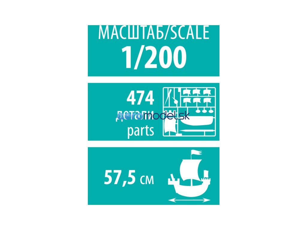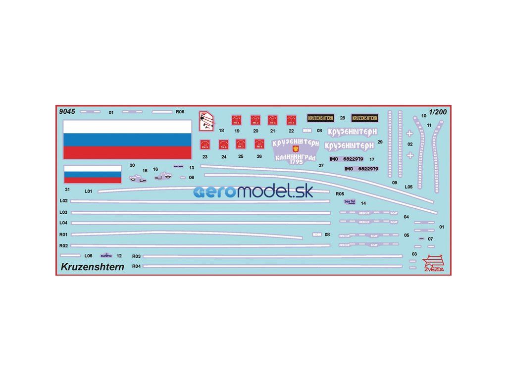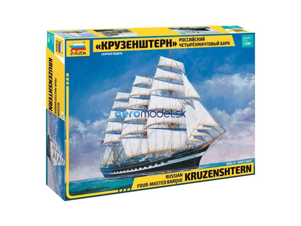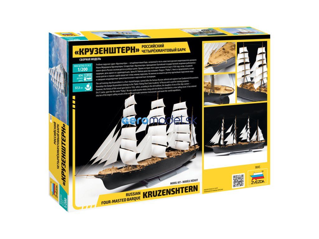 Plastikový model Zvezda 9045 - ruská štvorveslica "Kruzenštern" v mierke 1:200 na zlepenie. Stavebnica obsahuje 474 dielov, dĺžka 575 mm.