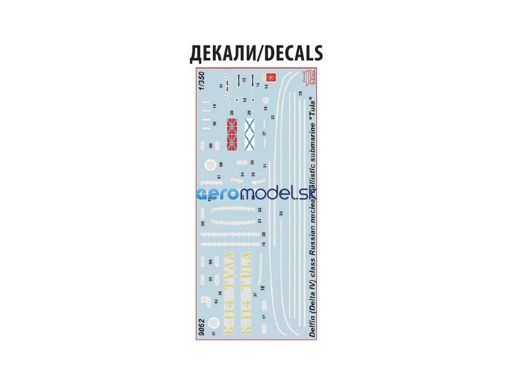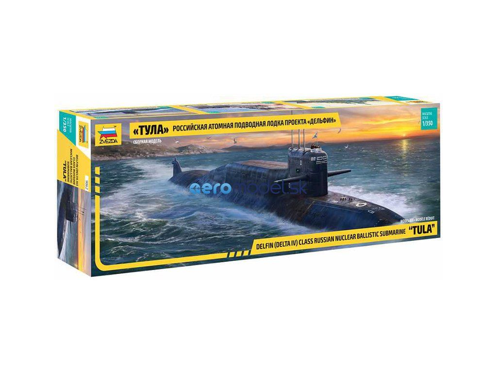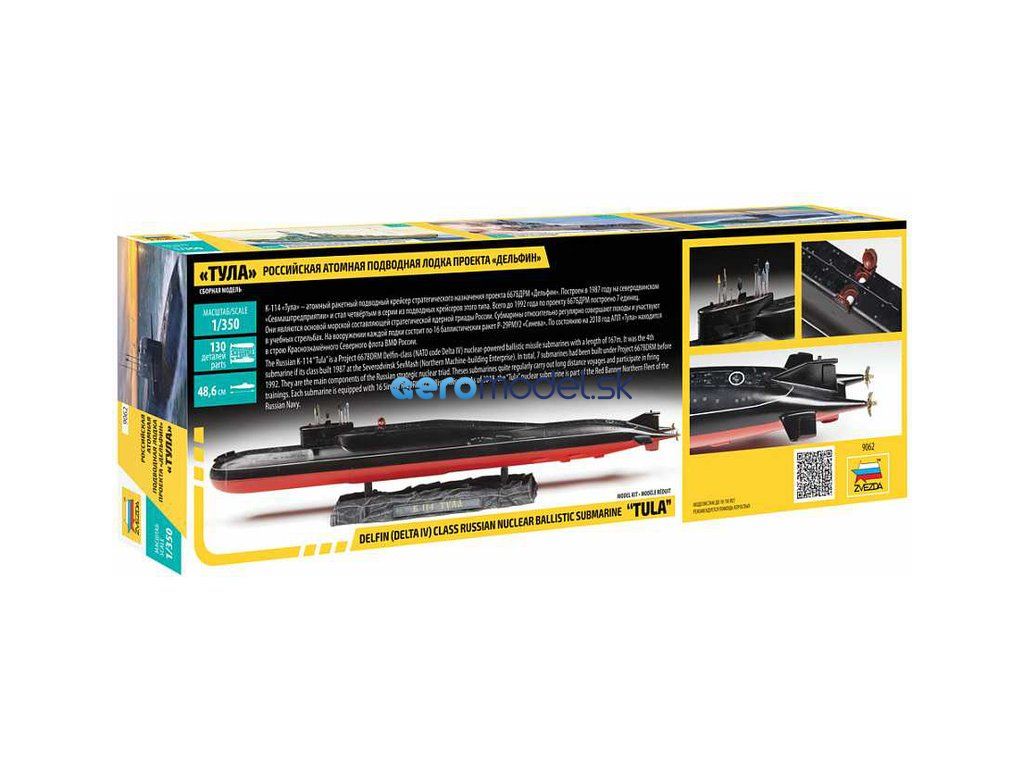 Plastikový model Zvezda 9062 - Tula Submarine Delfin/Delta IV Class jadrová ponorka v mierke 1:350 na zlepenie. Stavebnica obsahuje 130 dielov, dĺžka 486 mm.