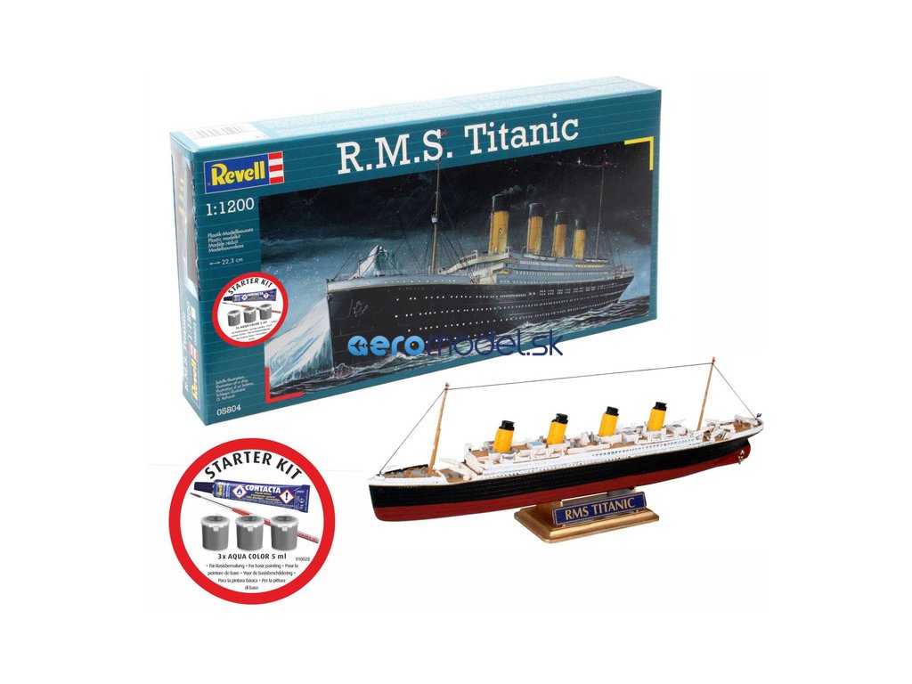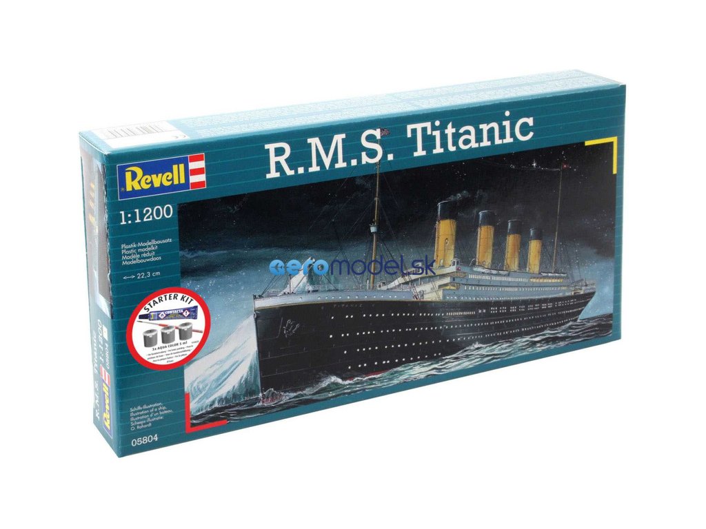 Plastikový model Revell 75804 – loď R.M.S. Titanic v měřítku 1:1200 ke slepení. Stavebnice obsahuje 40 dílků, délka 223 mm, obtížnost 3.