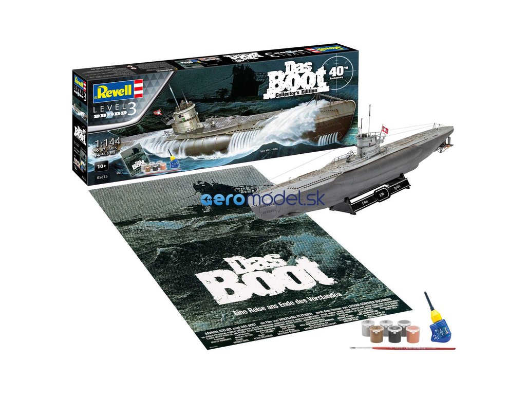 Plastikový model Revell 05675 - Nemecká ponorka U 96 Das Boot v mierke 1:144 na zlepenie. Stavebnica obsahuje 87 dielikov, lepidlo, štetec a akrylové farby. Dĺžka 106 mm, obtiažnosť 3. Limitovaná edícia v darčekovom balení k 40. výročiu rovnomenného filmu!