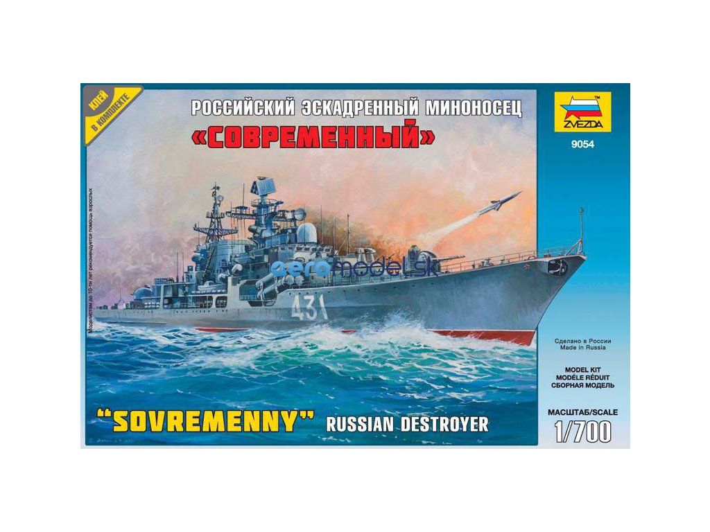 Plastikový model Zvezda 9054 - ruský torpédoborec "Sovremennyj" v mierke 1:700 na zlepenie. Sada obsahuje 144 dielikov, dĺžka 230 mm, obtiažnosť 3.