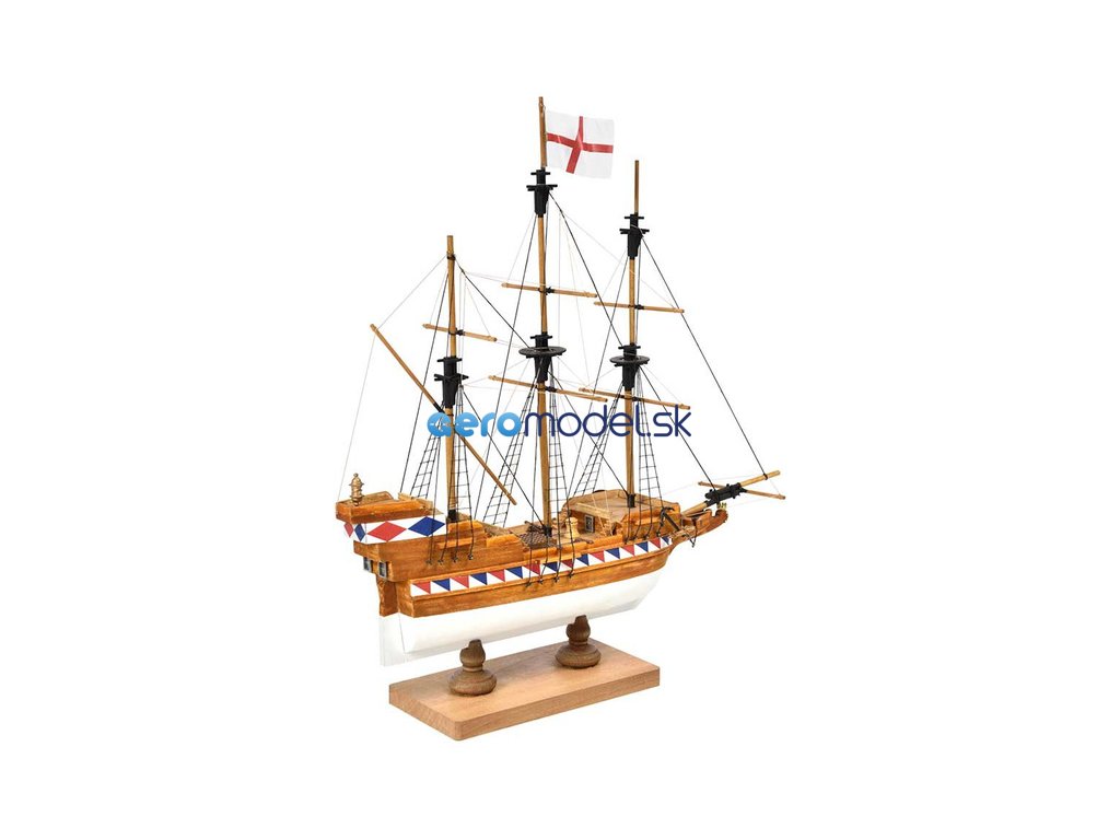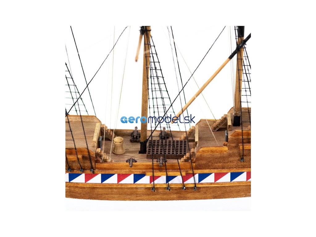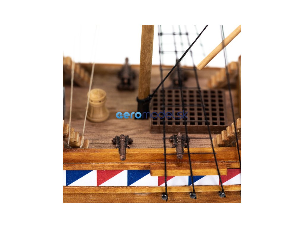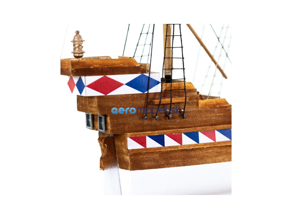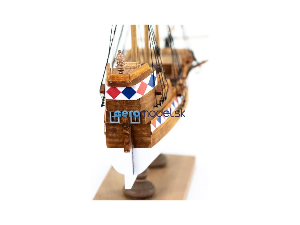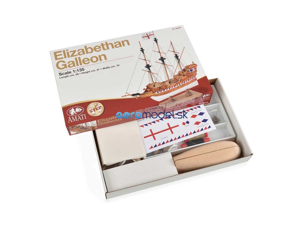 Stavebnice statické makety historické lodi, AMATI Galeóna 1:135 First step kit. Historické lodě jsou jedněmi z nejoblíbenějších lodních modelů, proto byla vytvořena série First step kit, která je určena pro začátečníky. V setu je hotový dřevěný trup lodi, kýl s výřezy a drobné příslušenství. Plachty nejsou v balení.
