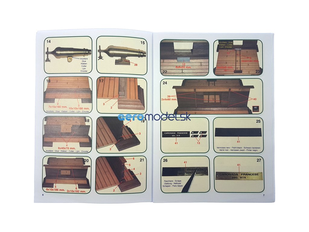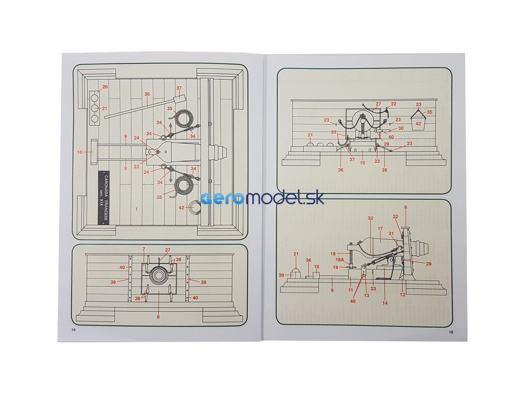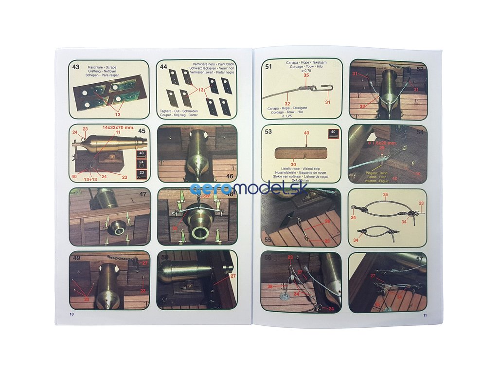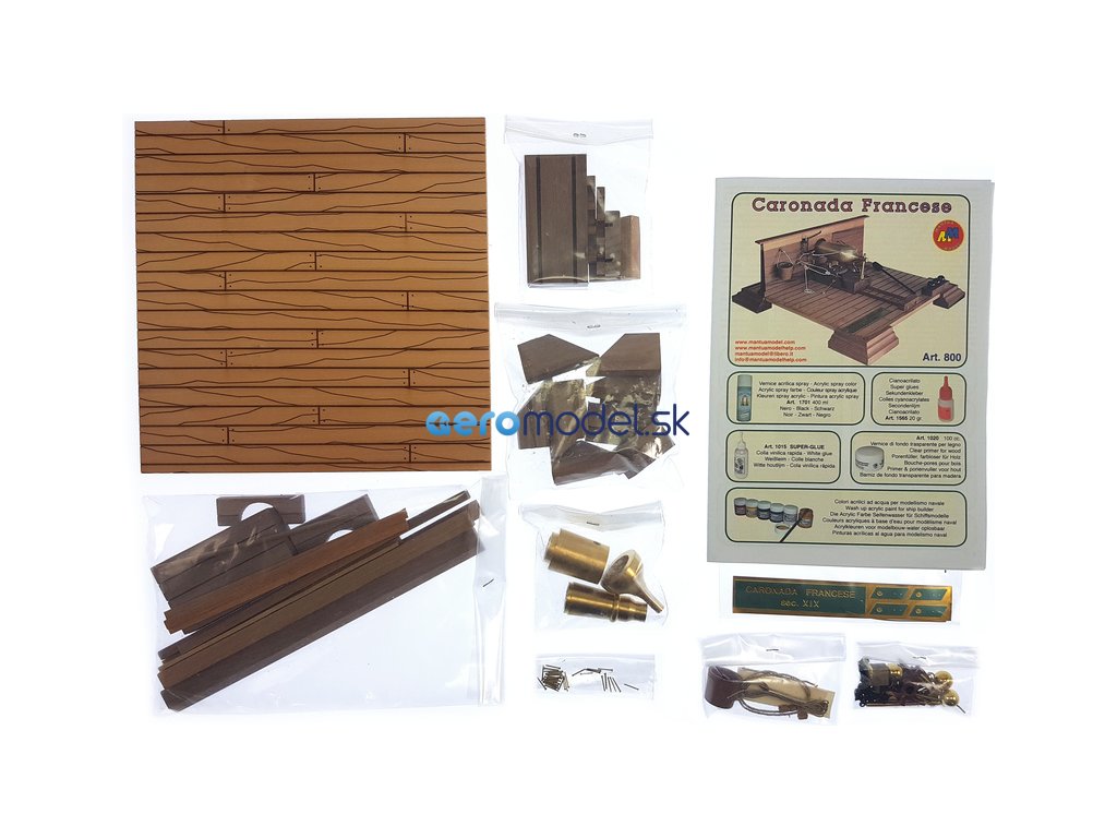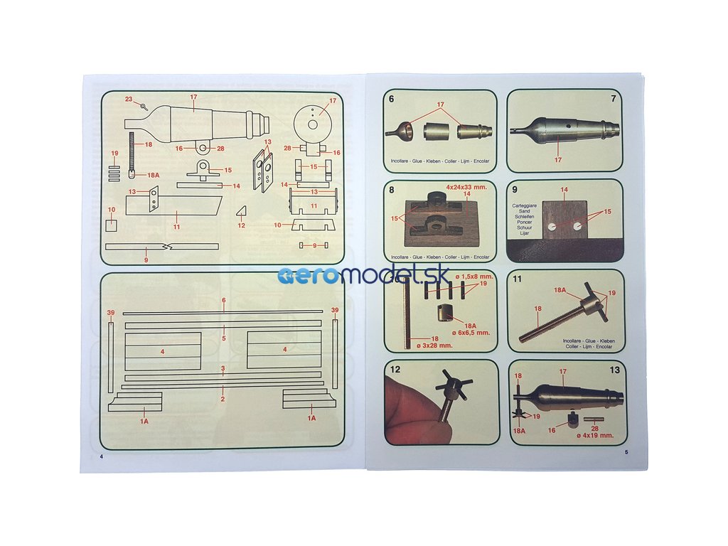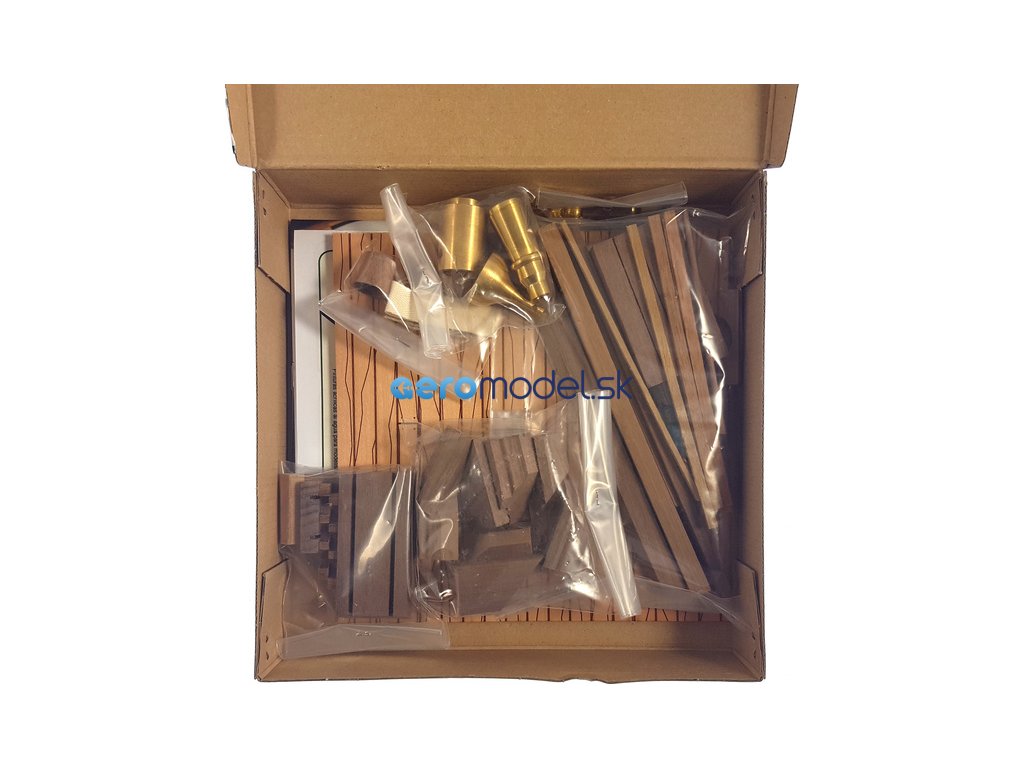 Balení obsahuje laserem vyřezávané dřevěné díly, hlaveň, kovové odlitky, lana, obrázkový návod ke stavbě.