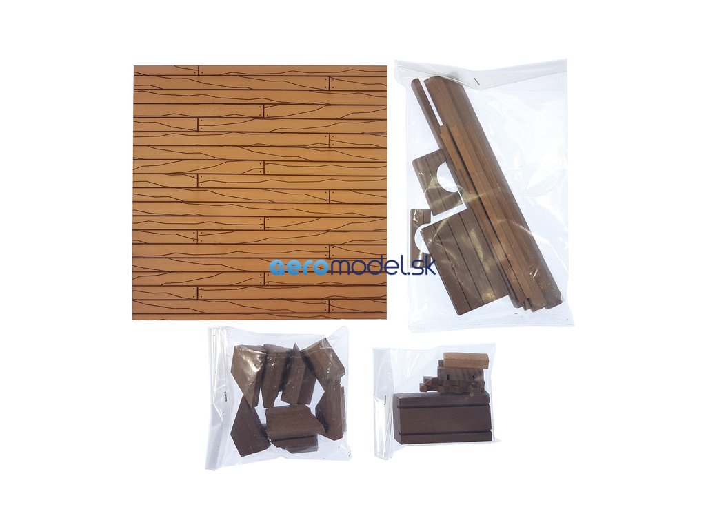 Po otevření víka krabice naleznete dřevěné díly a drobné součásti v plastových sáčcích a manuál.