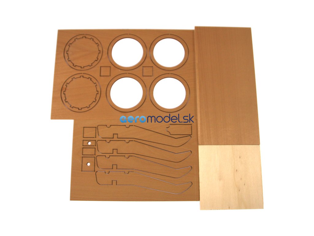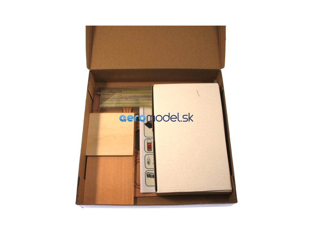 Po otevření víka krabice naleznete dřevěné díly modelu z překližky, lišty, drobné součásti v plastových sáčcích a manuál.