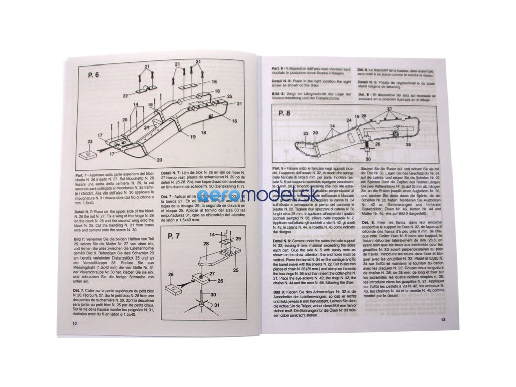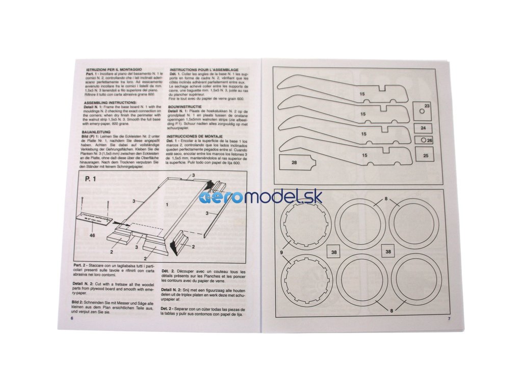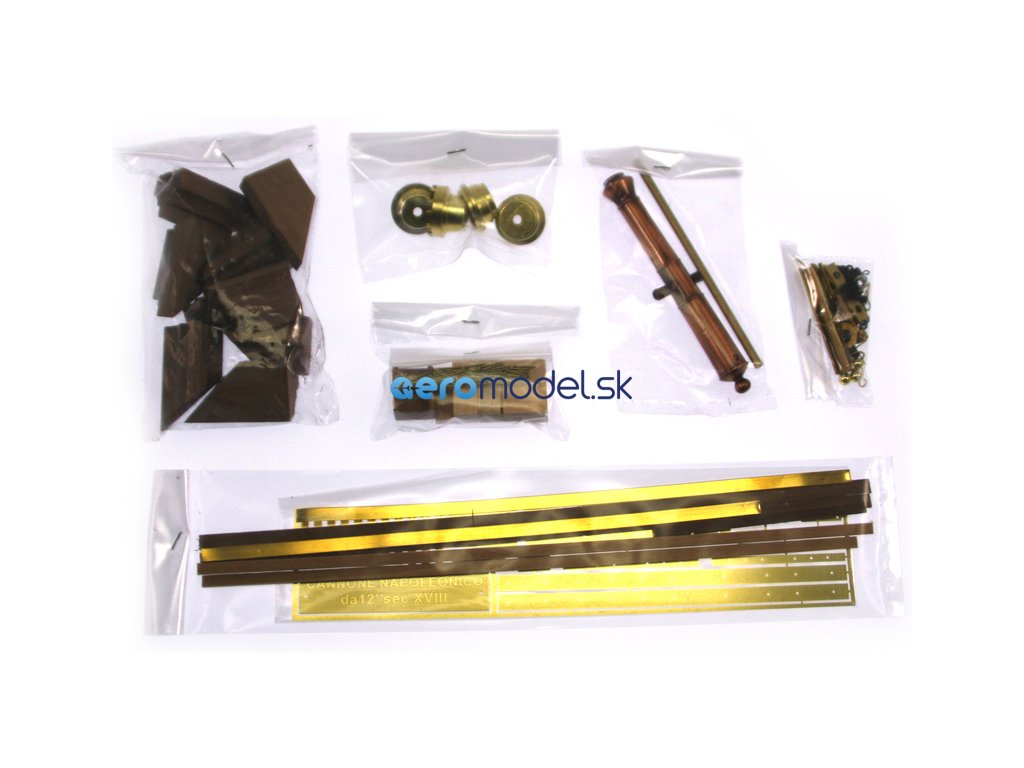Balení obsahuje laserem vyřezávané dřevěné díly, kovové odlitky, mosazné díly, hlaveň, vícejazyčný návod ke stavbě.