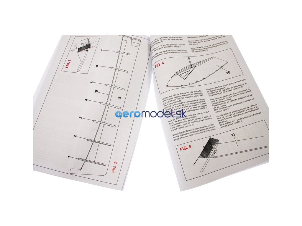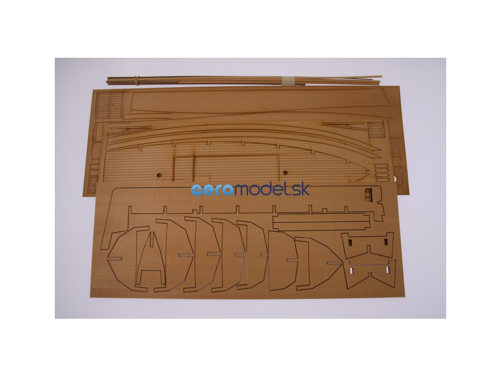 Balení obsahuje sadu překližkových dílů, dřevěné díly, drobné díly pro dokončení modelu, stavební plány, návod s výkresy a vícejazyčný manuál.