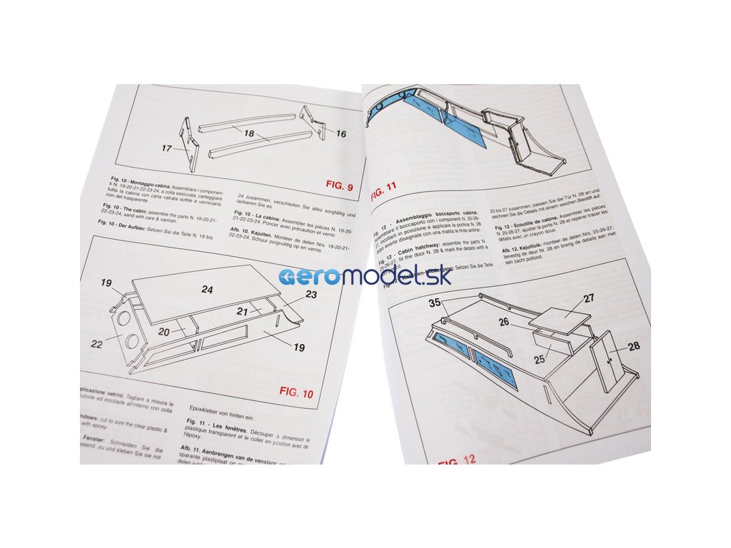 Po otevření víka krabice naleznete dřevěné díly modelu z překližky, sadu lišt, drobné součásti uzavřené v sáčcích, sadu výkresů a manuál.