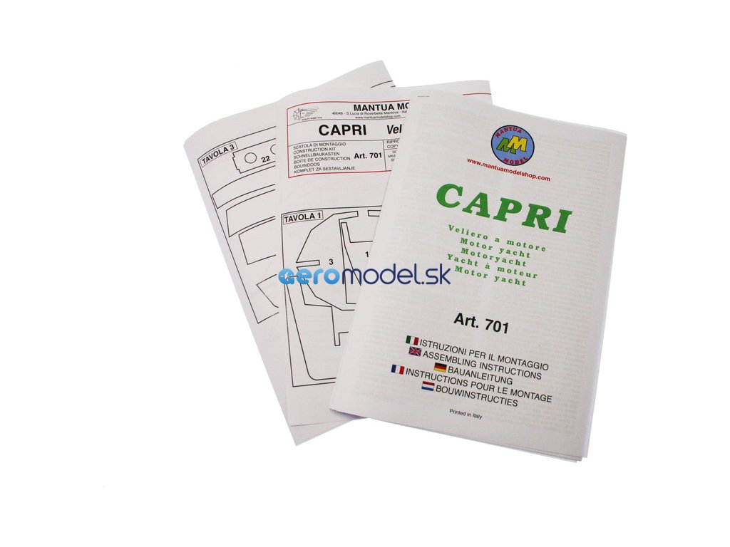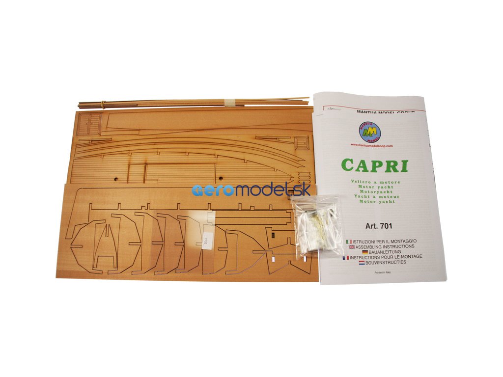 Capri je ideálním základním modelem pro stavbu modelů lodí z dřevěných stavebnic. Stavebnice je plně vybavena přesně pasujícími dřevěnými díly řezanými laserem, potřebnými malými částmi pro dokončení modelu a stavebním plánem s perspektivními výkresy. Popis stavby je kromě němčiny napsán také v italštině, angličtině, francouzštině a holandštině. Součástí dodávky je také stojánek na loď.
