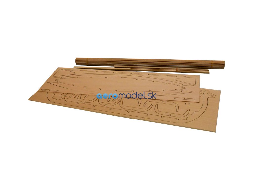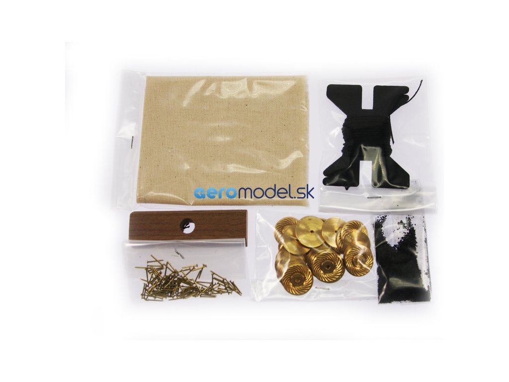 Po otevření víka krabice naleznete dřevěné díly modelu z překližky, sadu lišt, drobné součásti uzavřené v sáčcích, sadu výkresů a manuál.