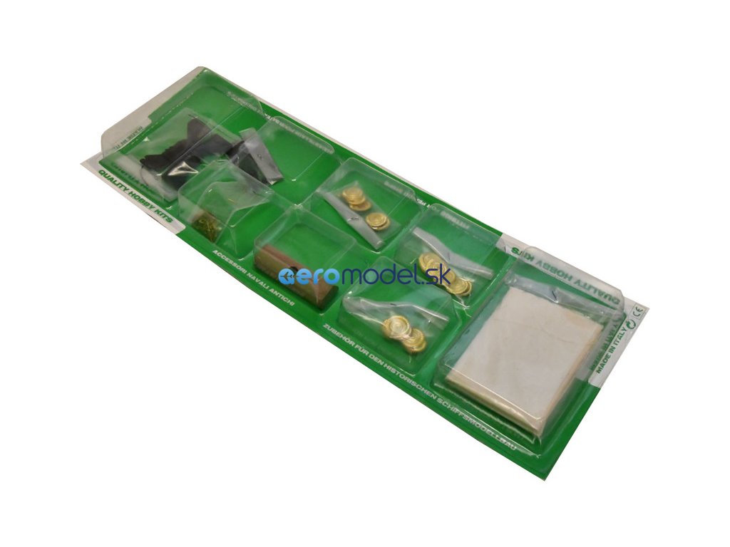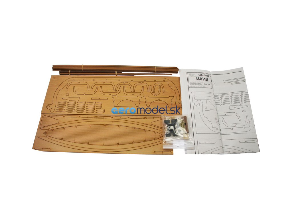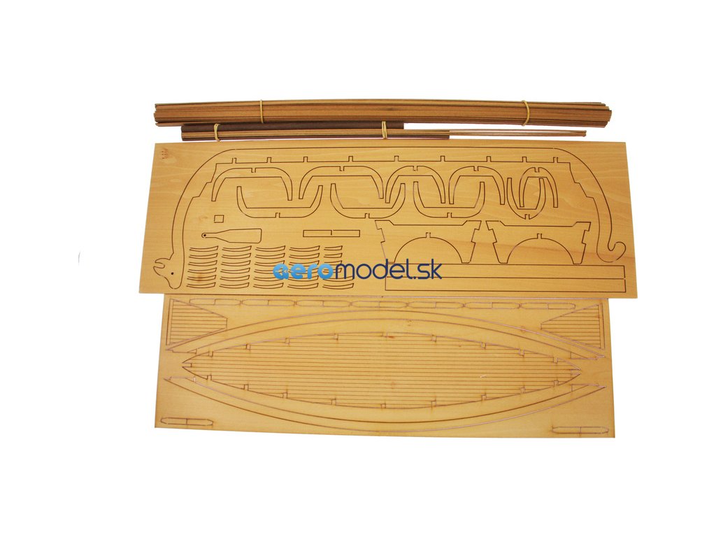 Balení obsahuje laserem řezané dřevěné díly, stěžen, ráhno, lanoví, plachtovinu a mosazné dekorace. Stavební plán.