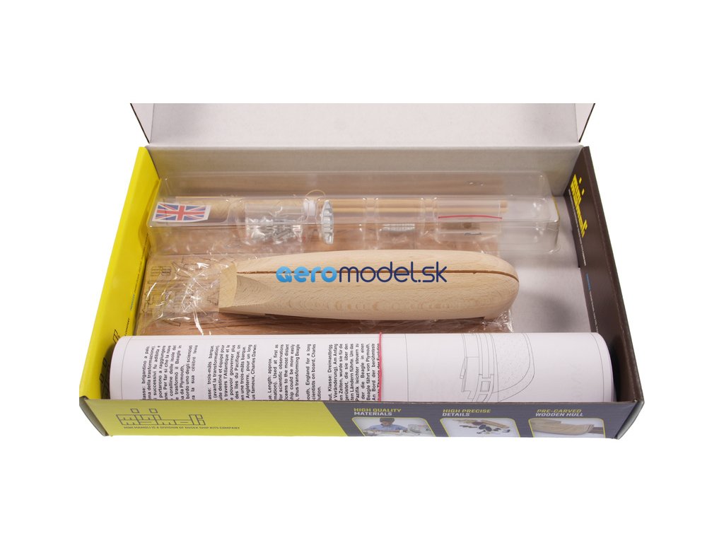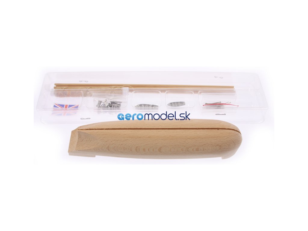 Balení obsahuje hotový polotovar trupu, překližkové díly, dřevěné lišty, blistr s drobnými díly, sadu výkresů a anglický návod.