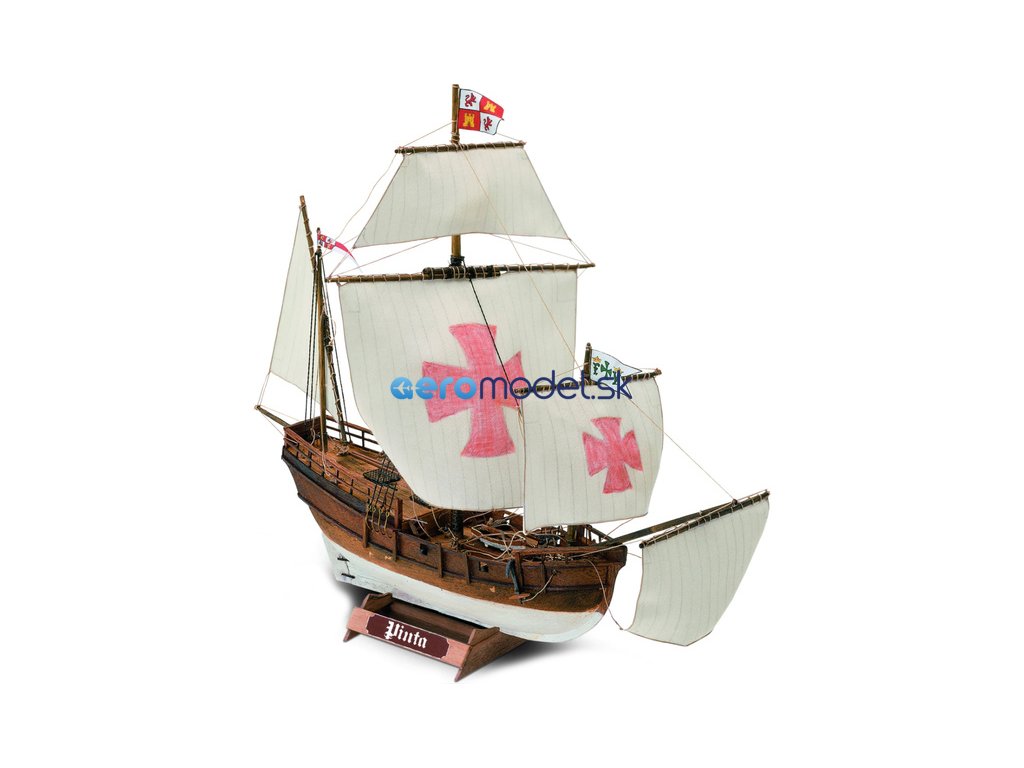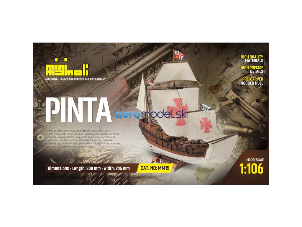 Model lodi Pinta, z řady Mini Mamoli, v měřítku 1:106. Není mnoho současných záznamů o lodích Niña a Pinta. Kromě některých skrytých odkazů v záznamech Kryštof Kolumbus, italsky Cristoforo Colombo. Nicméně je známo, že obě patřily rodině Pinzonů a byly zpočátku vybaveny latexovými plachtami. Během první zastávky na Kanárských ostrovech byly v Pintě nahrazeny latinskými čtvercovými plachtami. Toto, spolu s výměnou stožáru, odložilo cestu o 4 týdny. Kolumbus vždy odkazoval na Niña a Pinta jako "Caravels". Pak 12. října 1492 Kryštof Kolumbus, ve službách Španělska, vztyčil španělskou vlajku na ostrově, který již není pro Evropu neznámý.