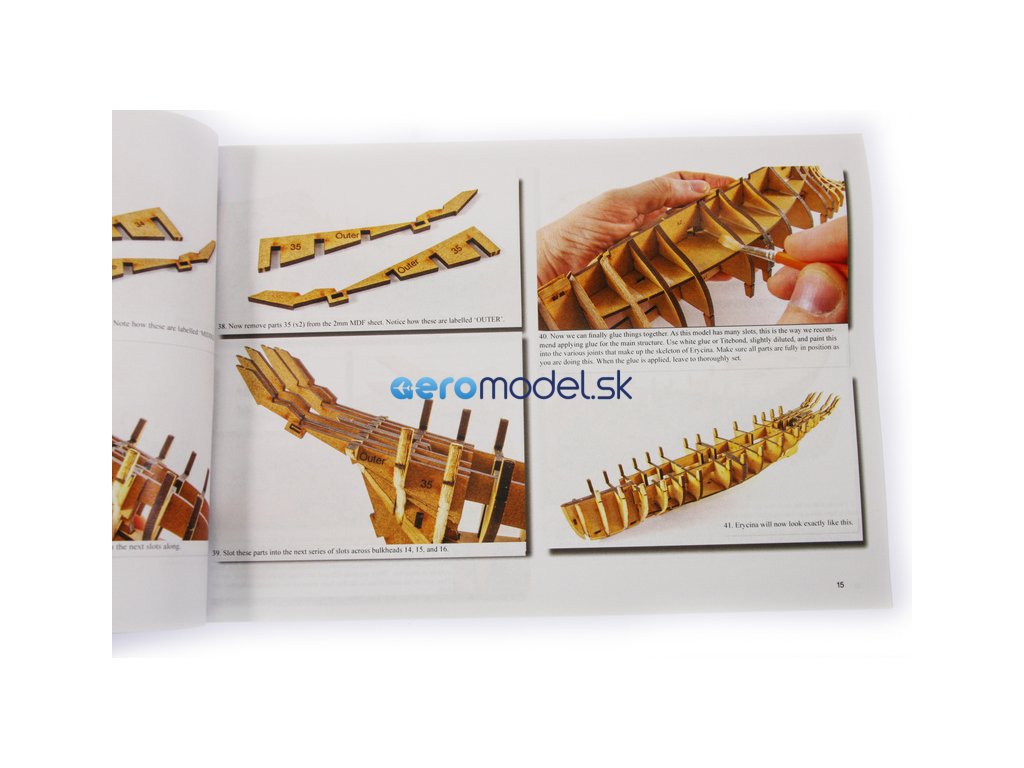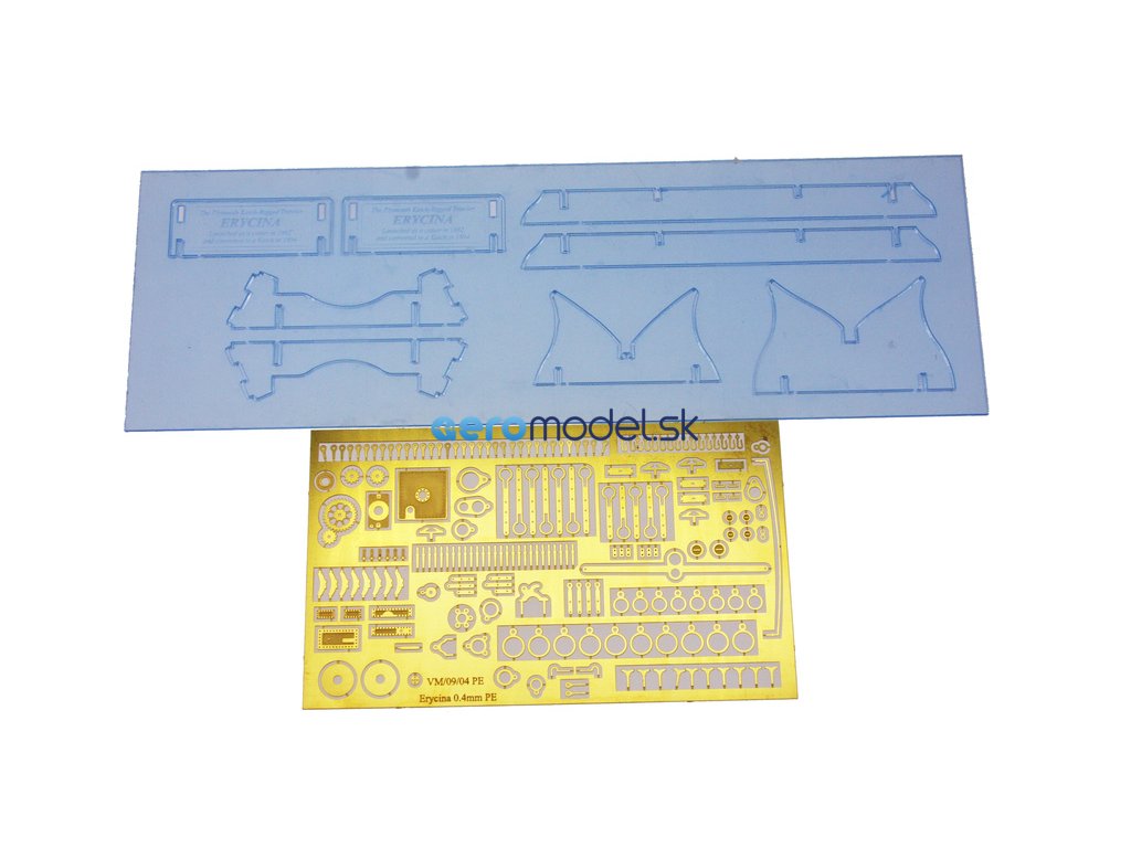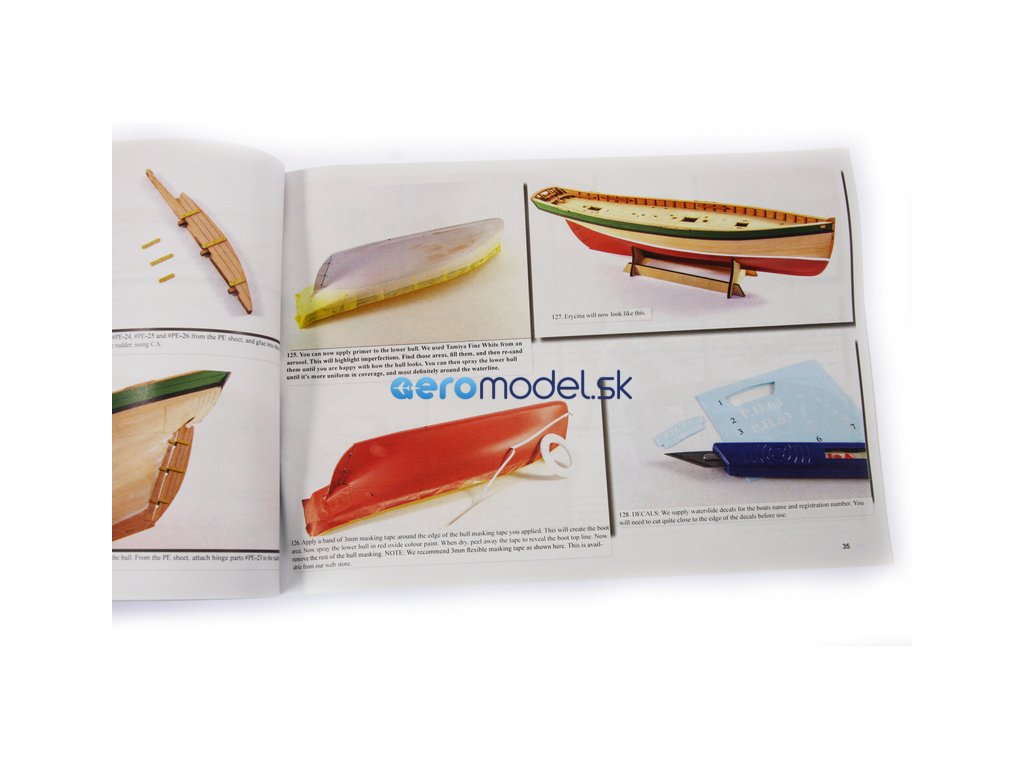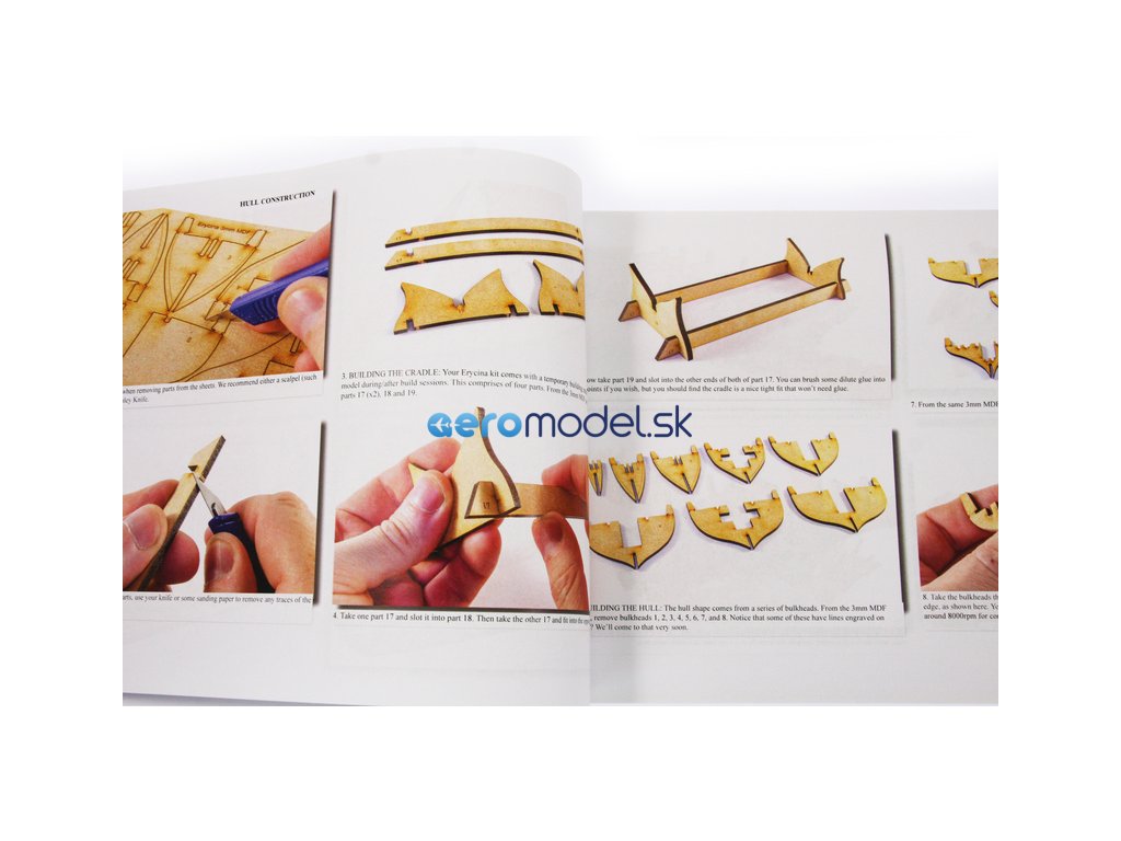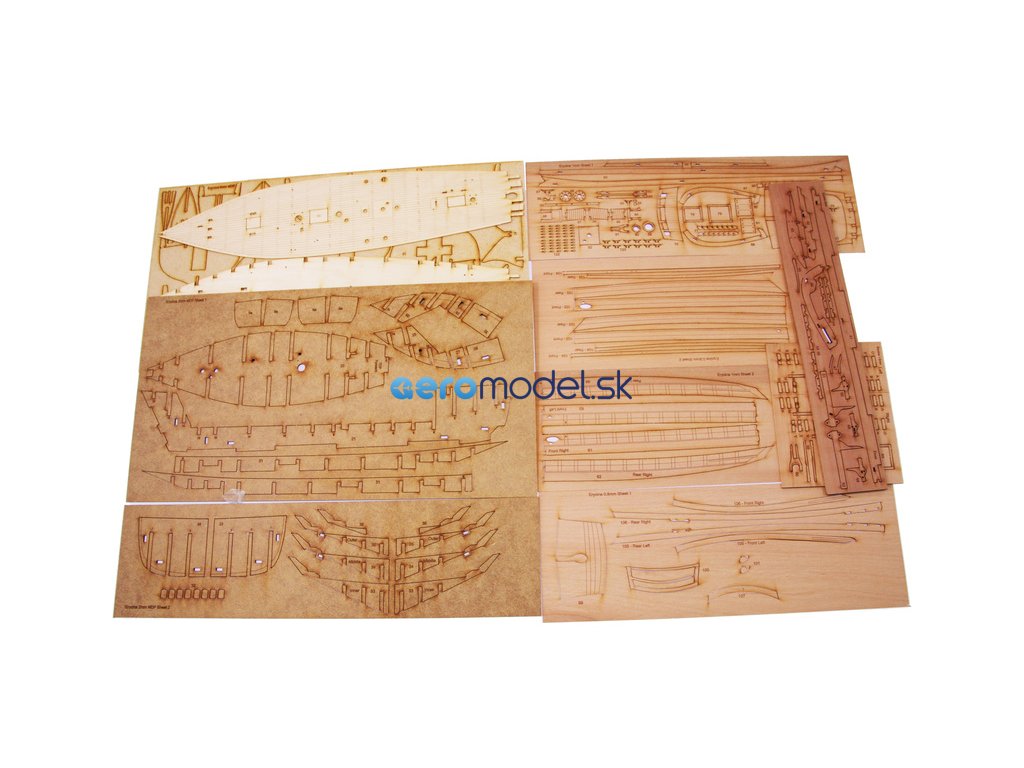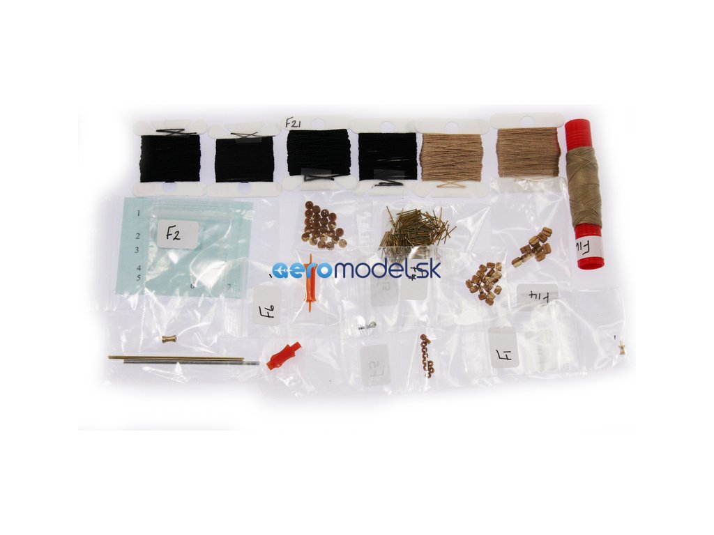 Balení obsahuje sadu překližkových dílů, sadu dřevěných lišt o různém průřezu, sáčky s drobnými díly, díly z mosazi, sadu výkresů a vícejazyčný manuál EN.