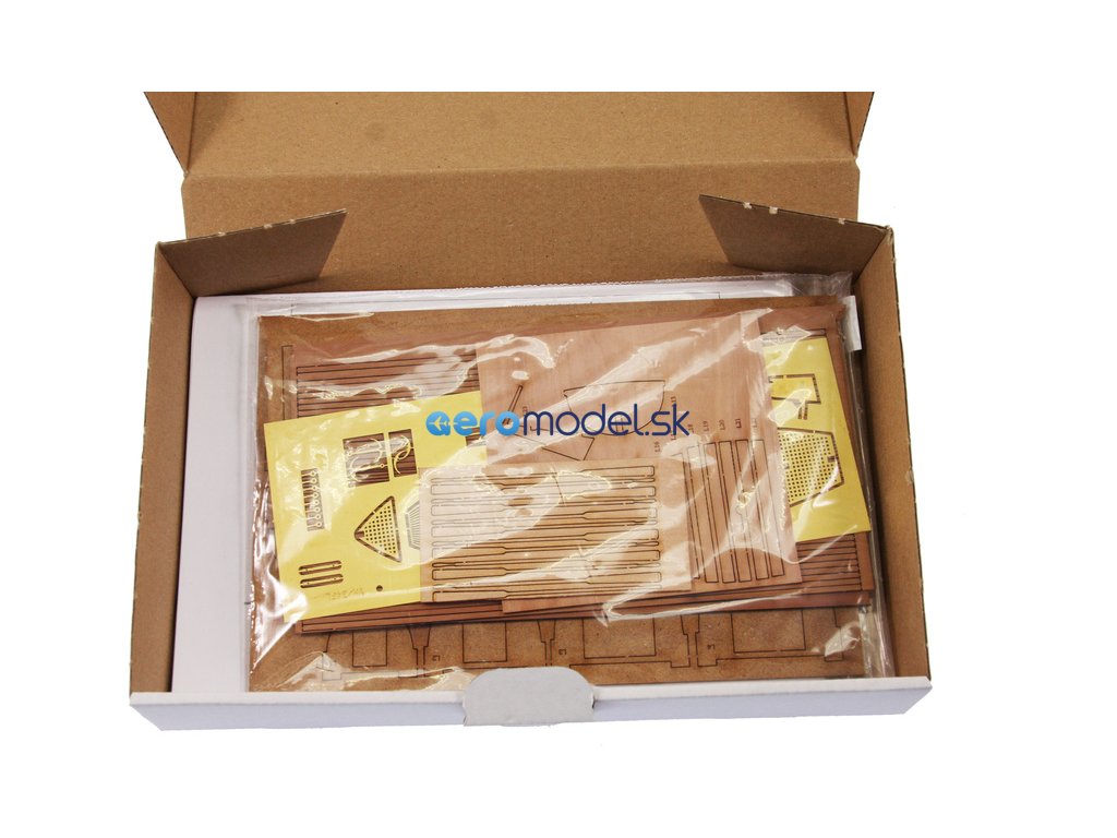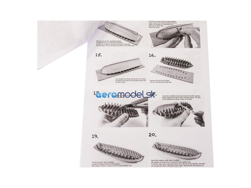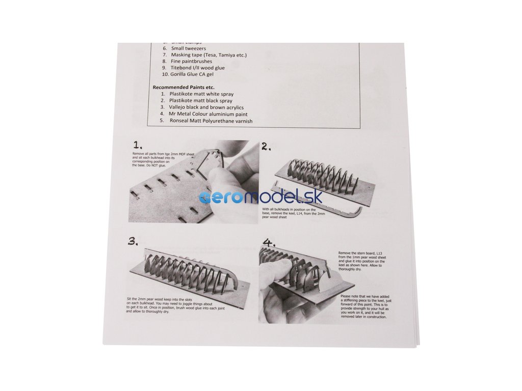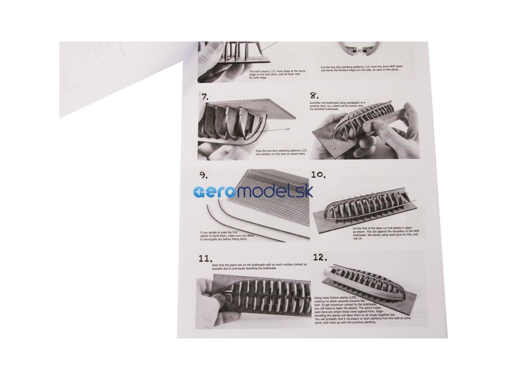 Balení obsahuje sadu překližkových dílů, díly z mosazi, stavební desku s výřezy pro stavbu kýlu a kostry a manuál EN.
