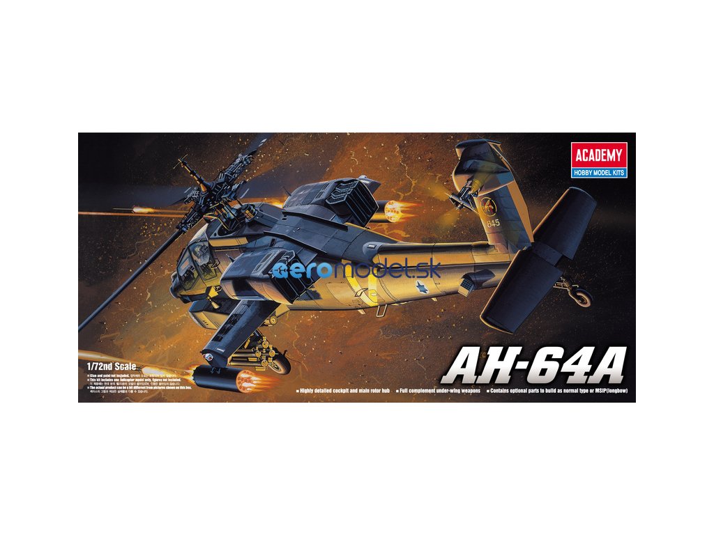 Plastikový model Academy 12488 - lietadlo Boeing AH-64A v mierke 1:72 na zlepenie.