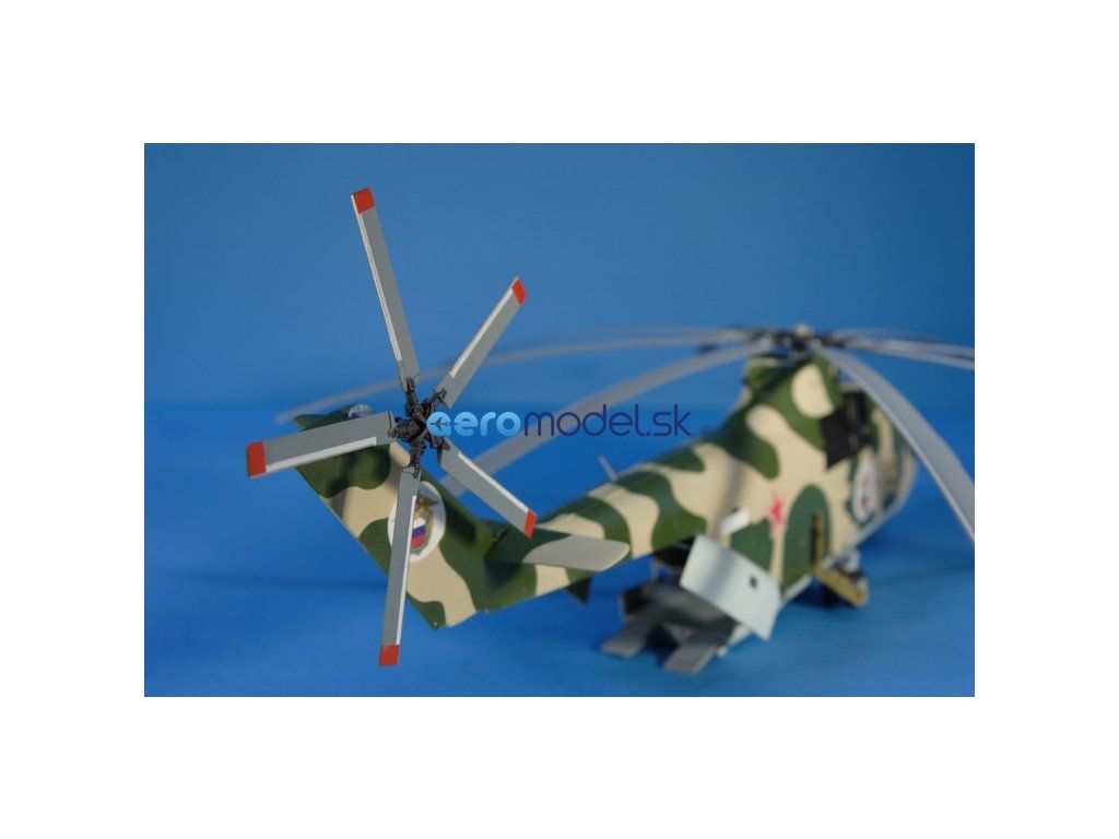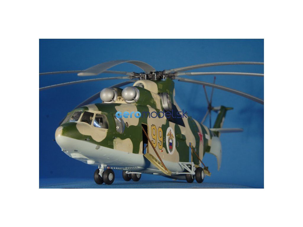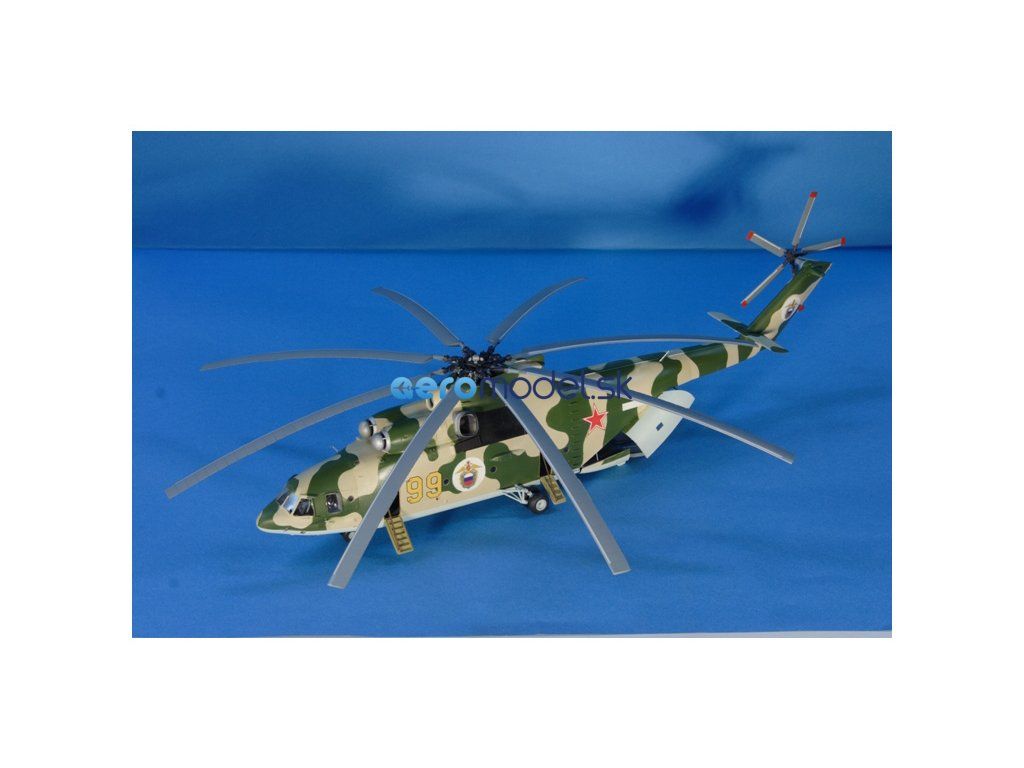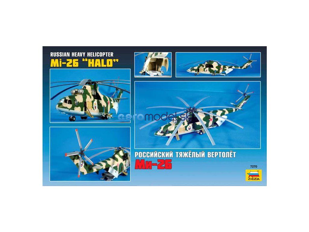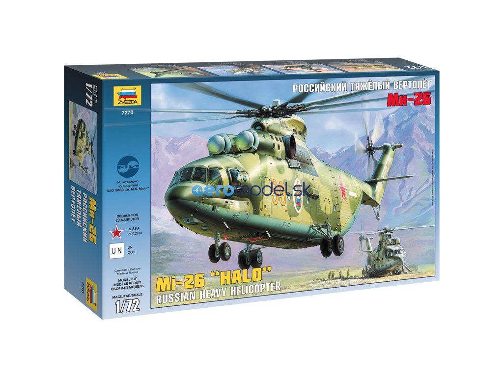 Plastikový model Zvezda 7270 - ruský ťažký vrtuľník Mi-26 v mierke 1:72 na zlepenie. Stavebnica obsahuje 238 dielikov, dĺžka 550 mm, obtiažnosť 3.