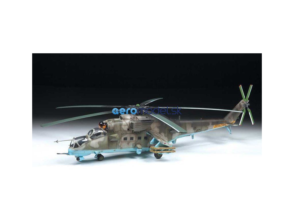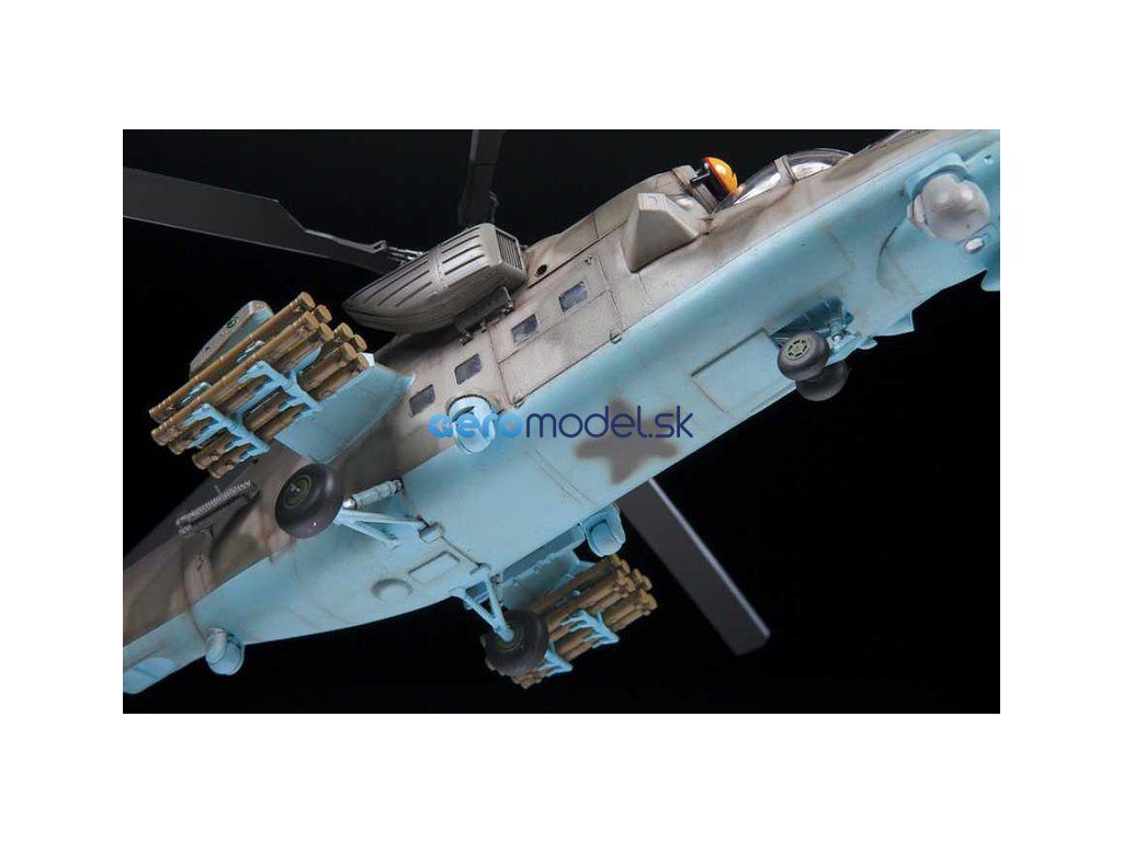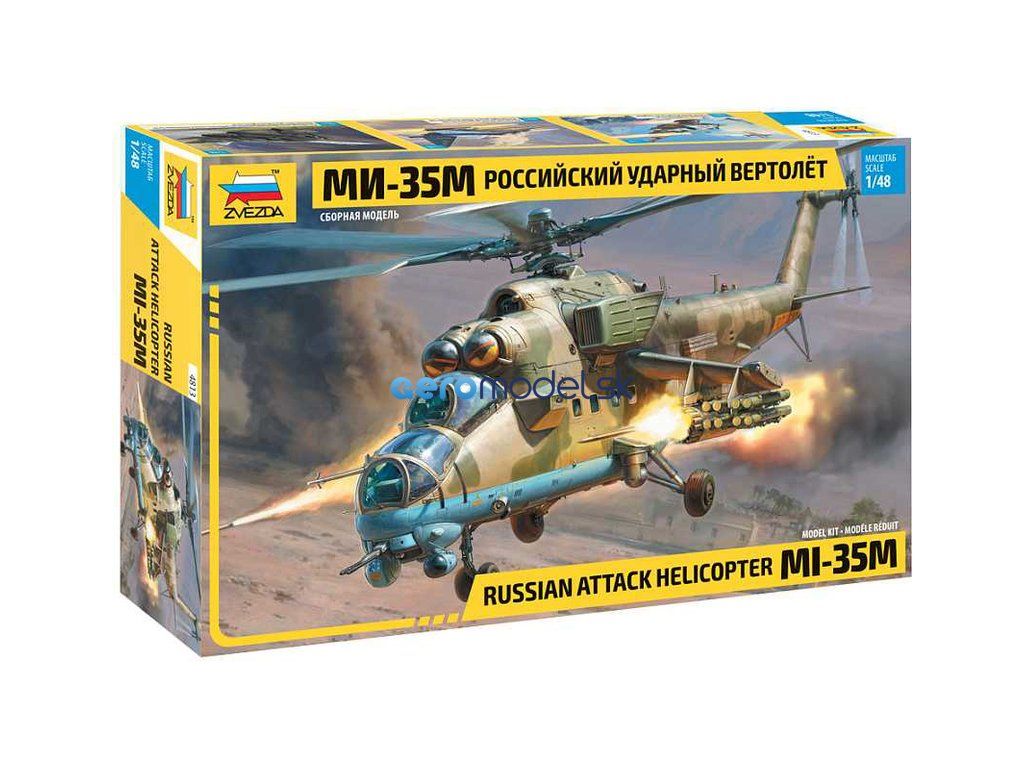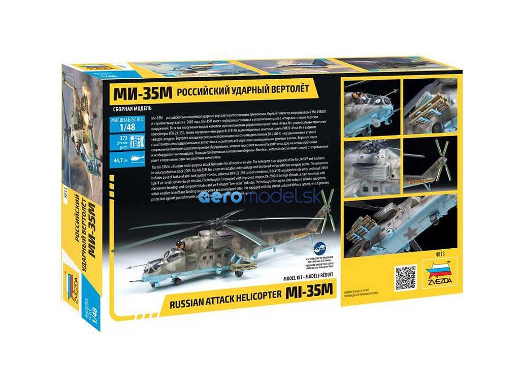 Plastikový model Zvezda 4813 - ruský viacúčelový útočný vrtuľník MIL Mi-35 M "Hind E" v mierke 1:48 na zlepenie. Stavebnica obsahuje 373 dielov, dĺžka 447 mm.