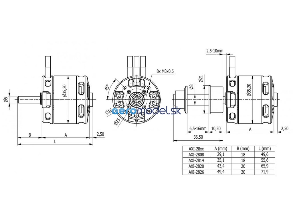 AXI 2826/8 V2 je střídavý motor učený pro pohon modelů s letovou hmotností do 2500 g s napájením z dvou- nebo tříčlánkového akumulátoru Li-poly. Výborně se hodí pro modely, jako jsou naše EPP "Warbirdy" a akrobatické modely o rozpětí 1300-1400 mm, Spitfire EP nebo Mustang EP od Phoenixu, hotlinery do 2 kg apod.