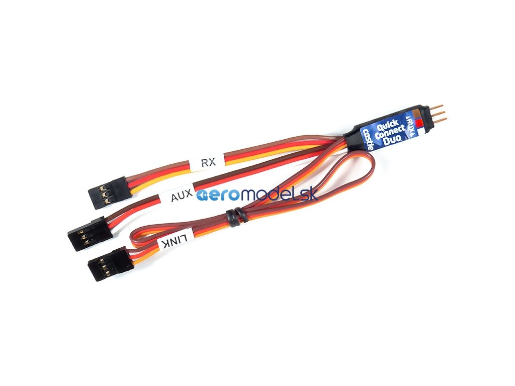 Propojka Castle Quick Connect Duo se zapojí mezi regulátor Castle a přijímač a umožní snadné programování pomocí programátorů Castle. Nebude nutné složité vysouvání konektoru regulátoru z přijímače, programátor stačí zapojit do volného vyvedeného konektoru.