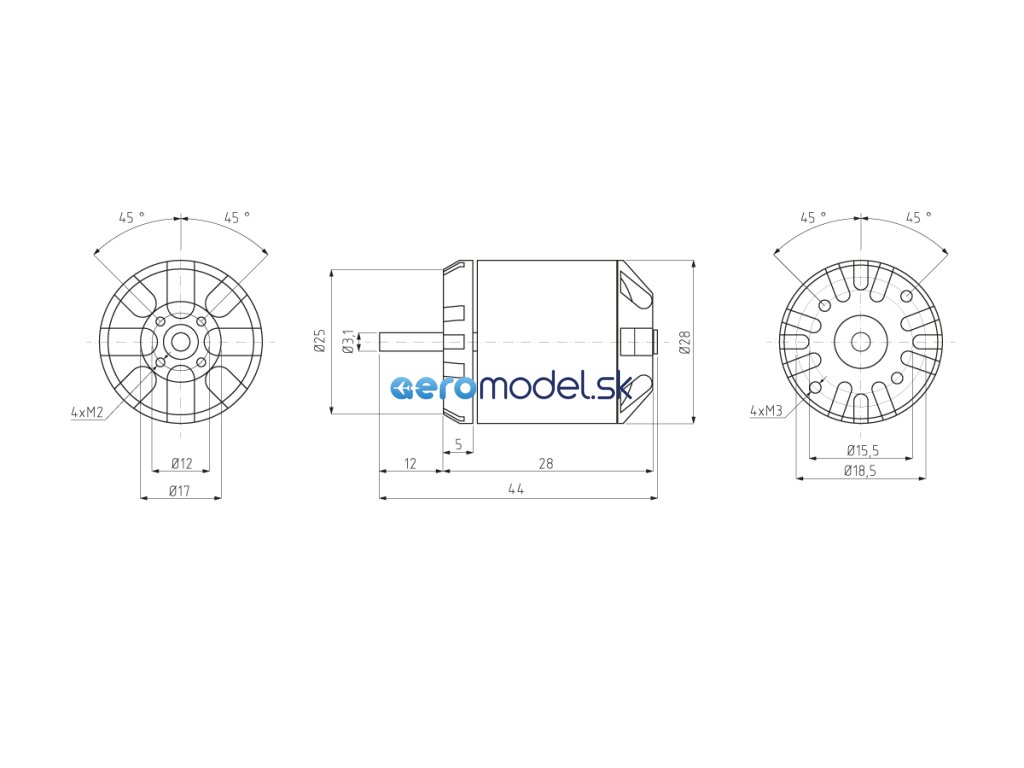 Montáž motoru: KAVAN C2830-750 je konstruován pro přední i zadní montáž. Při přední montáži za čelo motoru použijte nejméně dva (protilehlé), nebo čtyři šrouby M3, které zasahují do čela motoru v rozmezí 3 - 4 mm. Páry otvorů pro upevňovací šrouby v čele motoru jsou rozmístěny pravidelně o 180° na kružnicích o průměru 16 a 19 mm. Motorová přepážka by měla být z 2-3 mm letecké překližky. Sada pro zadní montáž (upevňovací kříž, unašeč vrtule pro zadní motáž) je dodávána spolu s motorem.