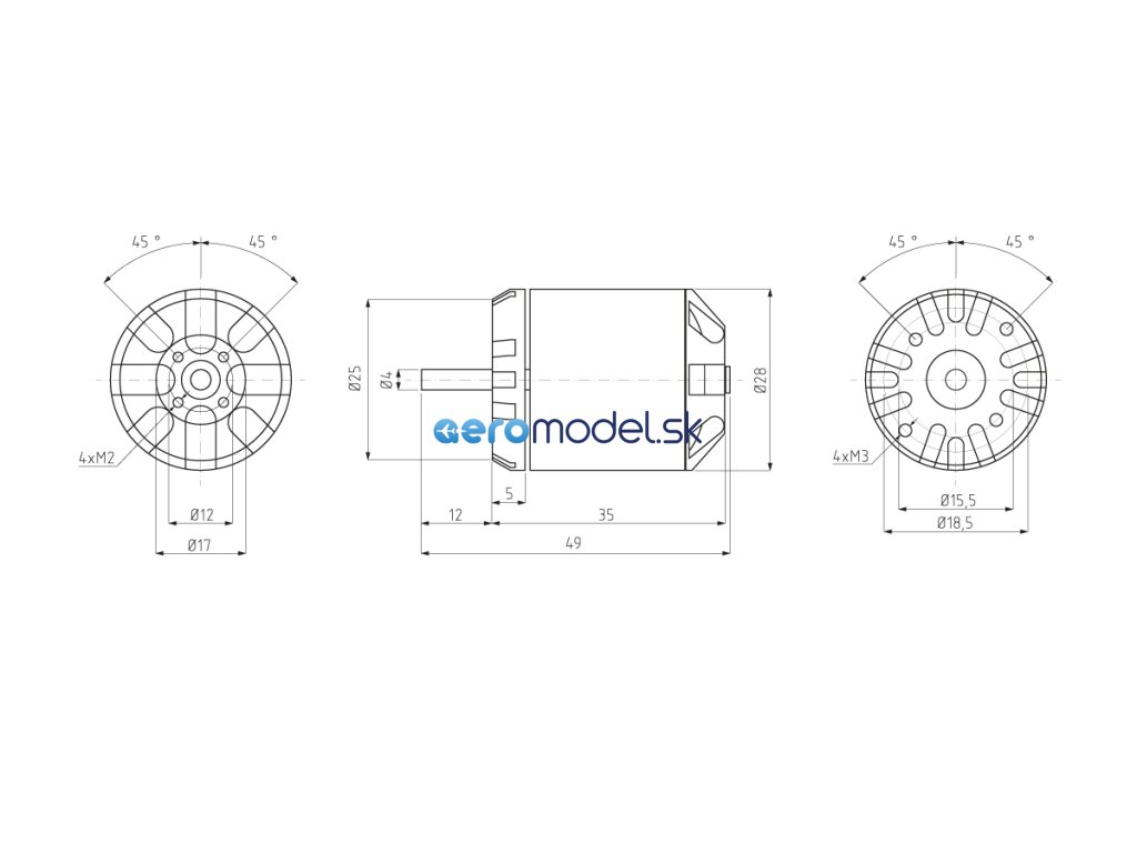 Sada motoru obsahuje: motor C2836-850 s kabely s připájenými 3,5 mm zlacenými konektory, sadu pro zadní montáž, návod.