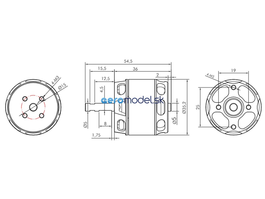 Montáž motoru: KAVAN PRO 3536-1150 je konstruován pro přední i zadní montáž. Při přední montáži za čelo motoru použijte čtyři šrouby M3, které zasahují do čela motoru v rozmezí 3,5-4 mm. Motorová přepážka by měla být ze 4 mm letecké překližky. Sada pro zadní montáž (upevňovací kříž, unašeč vrtule pro zadní montáž) je dodávána spolu s motorem.