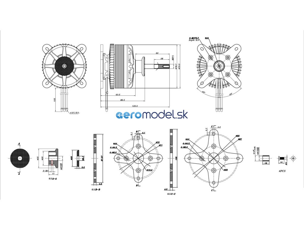 Montáž motoru: KAVAN PRO PRO 8045-215 je konstruován pro zadní montáž. Pro upevnění použijte čtyři ocelové šrouby M4; motorová přepážka by měla být z 8-10 mm letecké překližky.