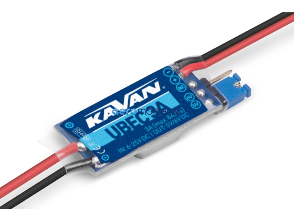 Použití moderních součástek a optimalizovaného obvodového řešení zaručuje minimalizaci rušení RC soupravy při nízké hmotnosti a malých rozměrech stabilizátoru. Napájecí napětí v rozsahu 6-25 V umožňuje UBEC používat až se šestičlánkovým Li-poly akumulátorem. Výstupní napětí (5,0 V nebo 6,0 V) je volitelné s pomocí zkratovací přepojky. Provozní stavy indikuje LED dioda.