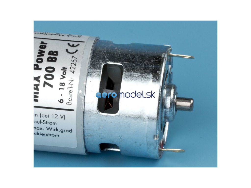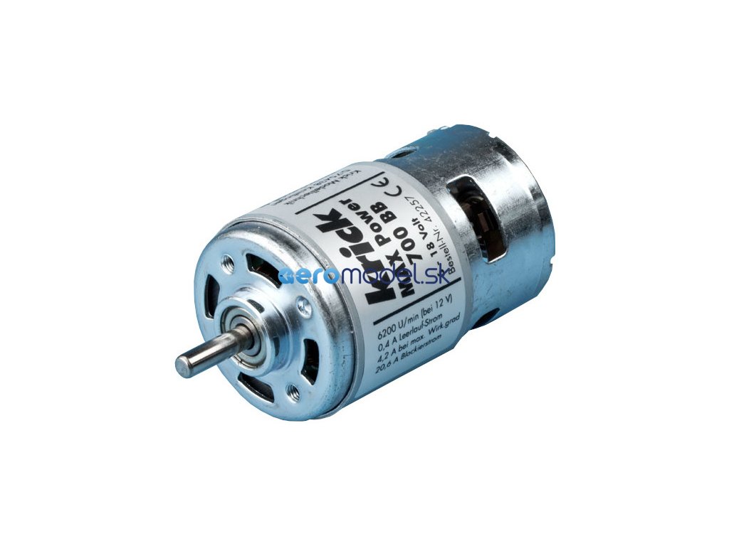 Krick Motor MAX Power 700 BB je stejnosměrný univerzální elektromotor řady 700 s vysokým točivým momentem, kuličkovými ložisky a vnitřním ventilátorem. Celkový rozměr Ø44 x 98 mm, hřídel Ø 5 mm, jmenovité napájecí napětí 12 V, proud do 20,6 A, hmotnost 340 g.