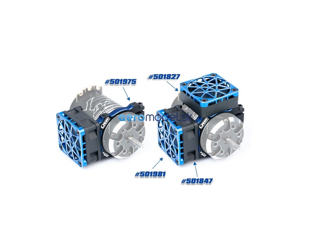 Systém chlazení motoru 1/8E se skládá z našeho hliníkového držáku ventilátoru WorksTeam (L501975), ventilátorů motoru WorksTeam SuperHighRev. (L501847 / L501827) a odpovídající hliníkové bezpečnostní síťky WorksTeam (L501981), která udržuje motor chladný za jakýchkoli podmínek.