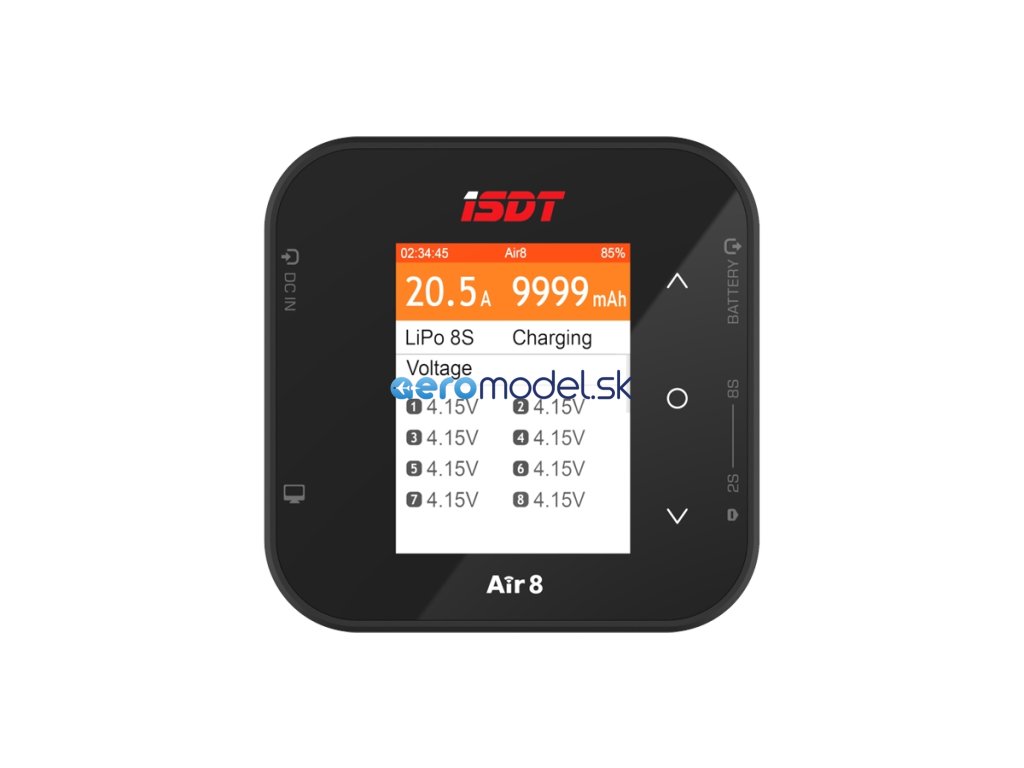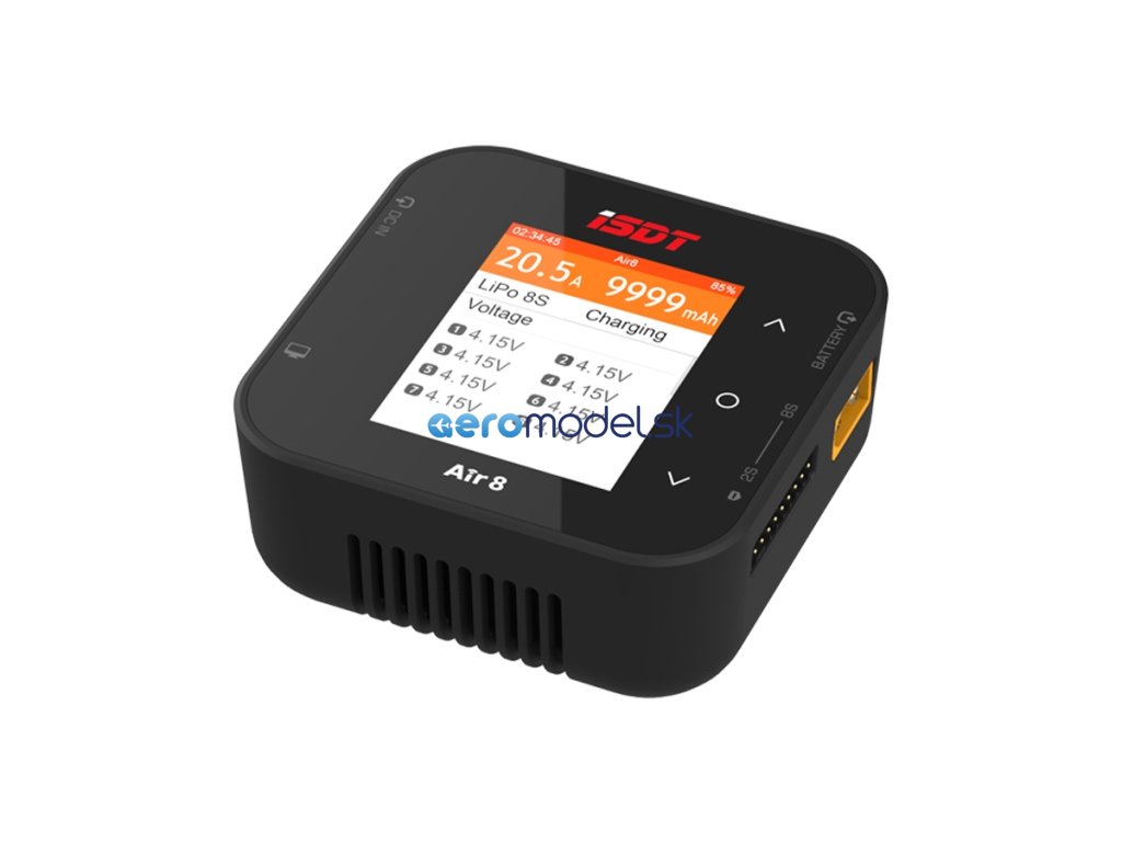 Miniaturní nabíječ ISDT Air 8 500W je výkonný inteligentní nabíječ s napájením z autobaterie nebo stabilizovaného síťového zdroje a velmi jednoduchou a přehlednou obsluhou. Air 8 umožňuje nabíjet a vybíjet běžné typy článků (NiCd, NiMH, LiPo, LiHV, ULiHV, Li-ion, LiFe, Pb), navíc je vybaven vestavěným osmikanálovým balancerem, který zajišťují bezpečné nabíjení lithiových akumulátorů. Nabíječ je vybaven barevným LCD displejem a dotykovými programovacími tlačítky, které vám poskytnou možnost komfortního a velice přehledného nastavování parametrů, řízení a sledování průběhu nabíjení/vybíjení.