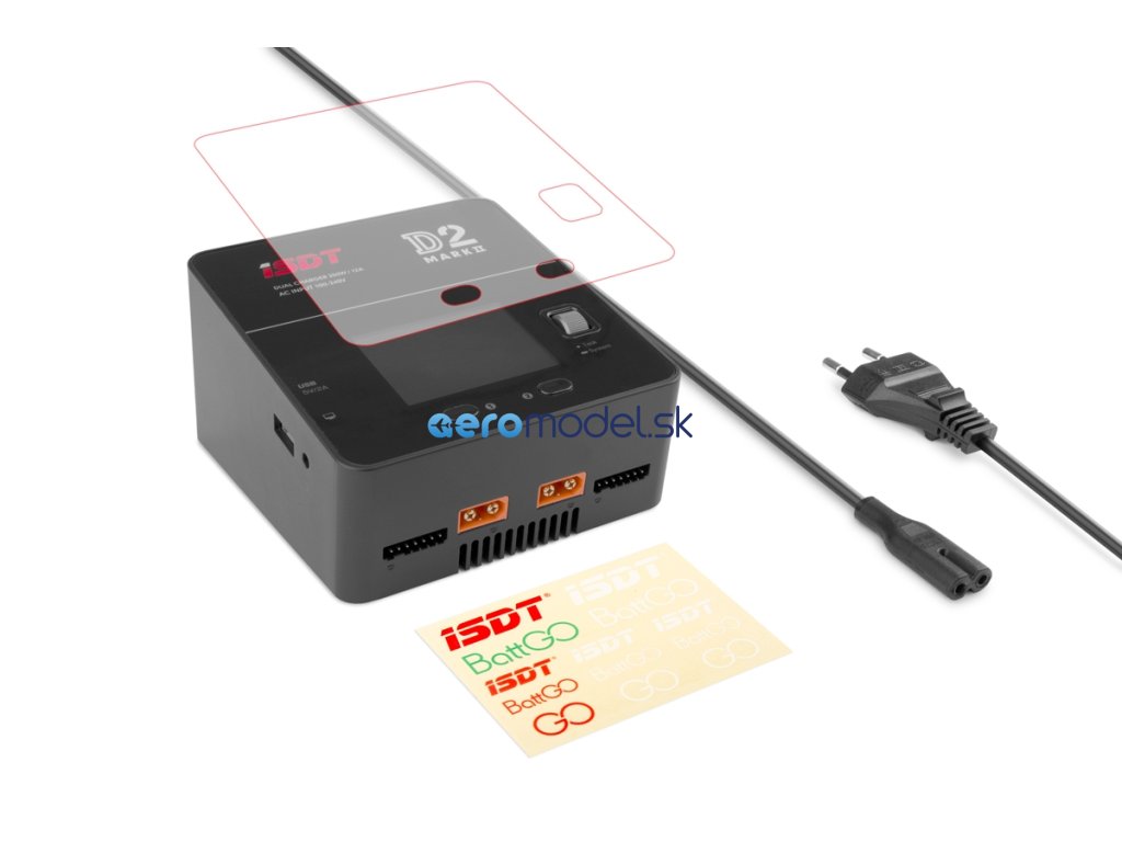 Sada nabíječe obsahuje: nabíječ ISDT D2 Mark II, síťový kabel, chránič displeje, návod.