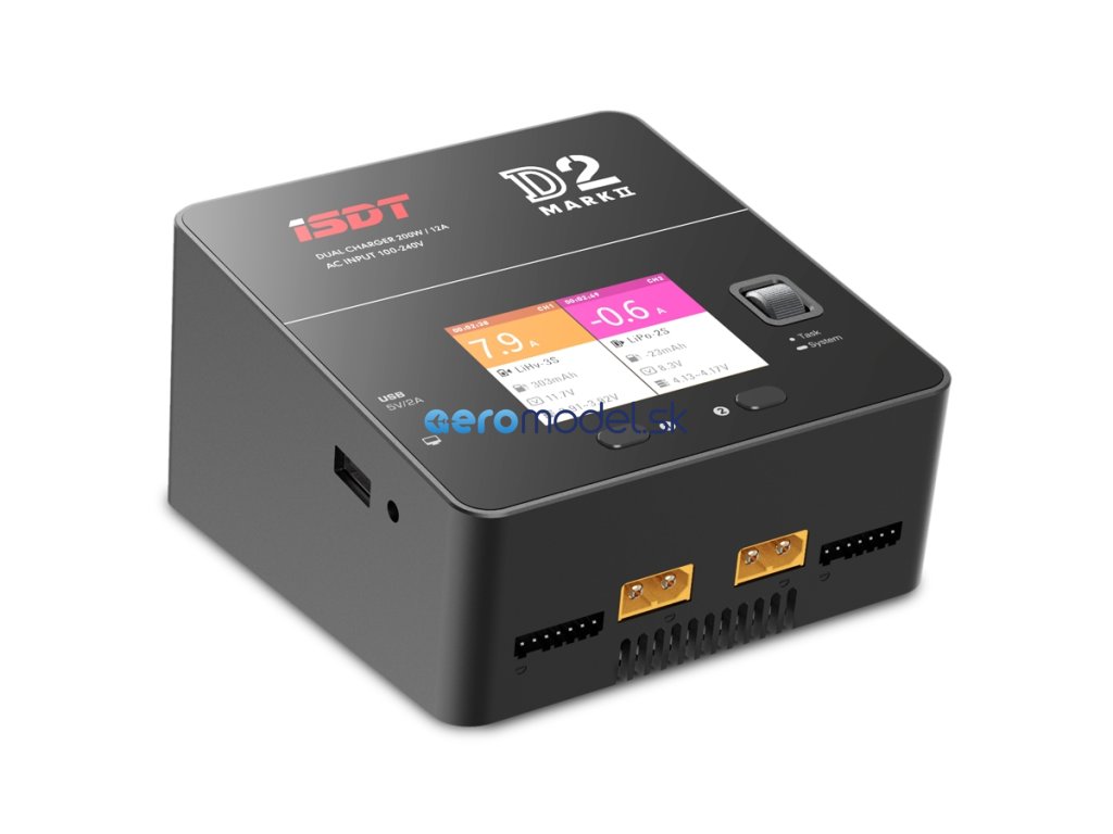 Malý dvoukanálový nabíječ ISDT D2 Mark II 2x200W je inteligentní nabíječ s vysokým výkonem s napájením ze sítě a velmi jednoduchou a přehlednou obsluhou. D2 Mark II umožňuje nabíjet a vybíjet běžné typy článků (NiCd, NiMH, LiPo, LiHV, ULiHV, Li-ion, LiFe, Pb), navíc je vybaven vestavěnými šestikanálovými balancery, které zajišťují bezpečné nabíjení lithiových akumulátorů. Nabíječ je vybaven barevným LCD displejem, programovacími tlačítky a kolečkem, které vám poskytnou možnost komfortního a velice přehledného nastavování parametrů, řízení a sledování průběhu nabíjení.