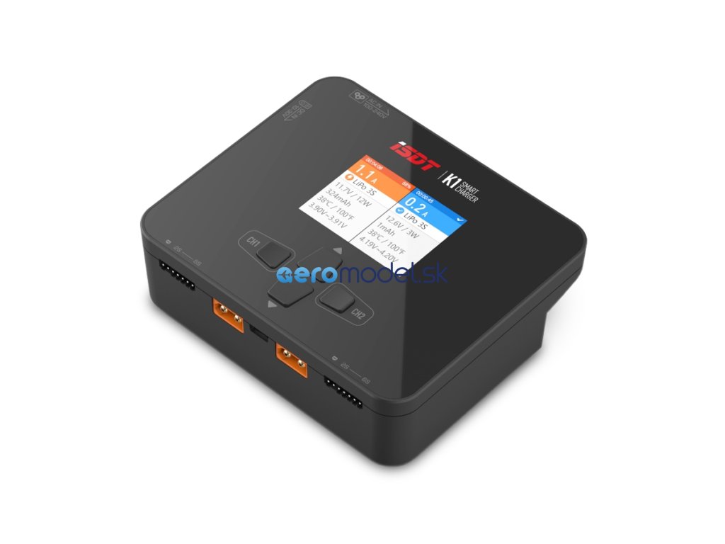 Malý dvoukanálový nabíječ ISDT K1 2x250W je inteligentní nabíječ s vysokým výkonem s napájením ze sítě i autobaterie a velmi jednoduchou a přehlednou obsluhou. K1 umožňuje nabíjet běžné typy článků (NiCd, NiMH, LiPo, LiHV, ULiHV, Li-ion, LiFe, Pb), navíc je vybaven vestavěnými šestikanálovými balancery, které zajišťují bezpečné nabíjení lithiových akumulátorů. Nabíječ je vybaven barevným LCD displejem a programovacími tlačítky, které vám poskytnou možnost komfortního a velice přehledného nastavování parametrů, řízení a sledování průběhu nabíjení.