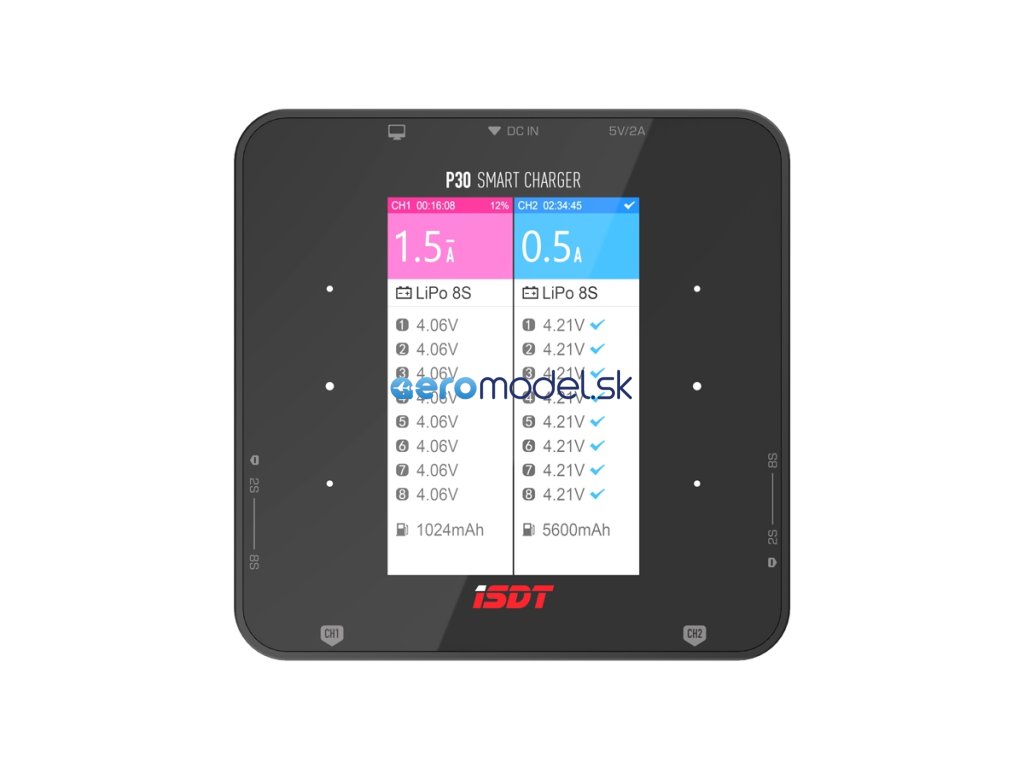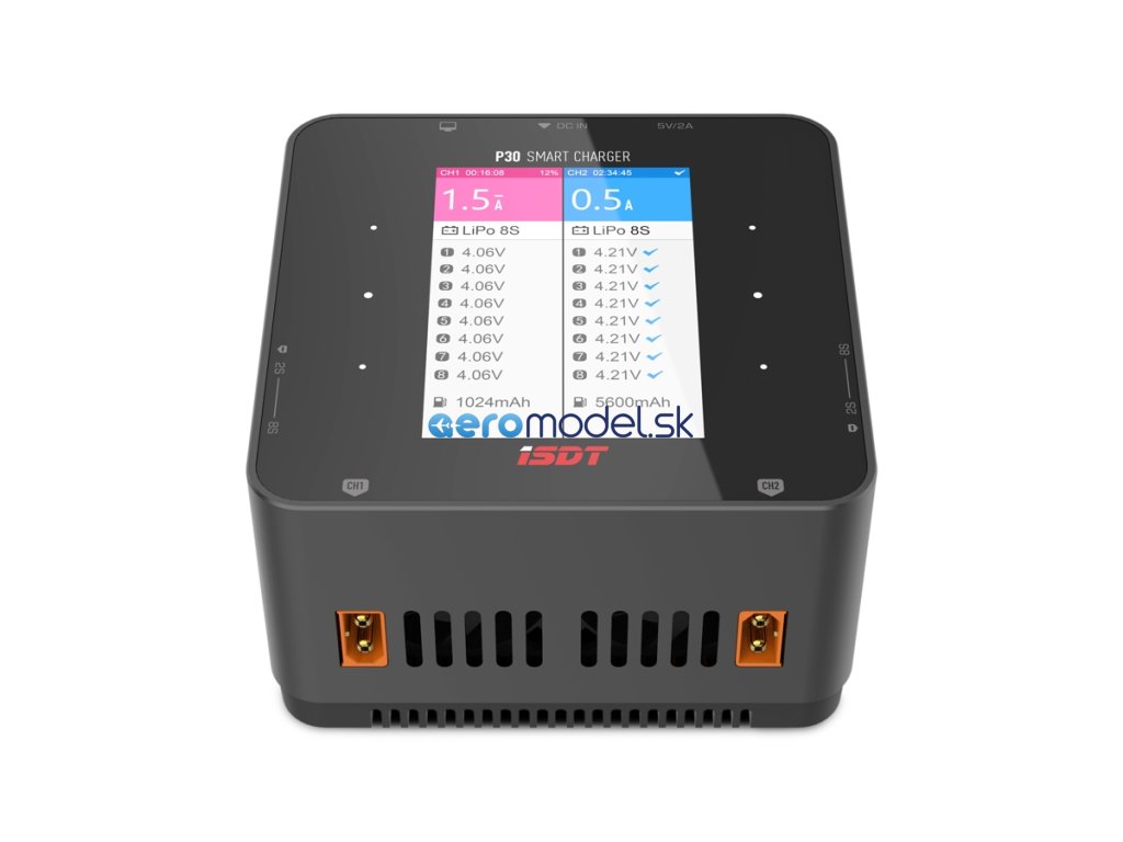 Vysokovýkonný dvoukanálový nabíječ ISDT P30 1500W je inteligentní nabíječ s napájením z autobaterie nebo výkonného stabilizovaného síťového zdroje a velmi jednoduchou a přehlednou obsluhou. P30 umožňuje nabíjet a vybíjet běžné typy článků (NiCd, NiMH, LiPo, LiHV, ULiHV, Li-ion, LiFe, Pb), navíc je vybaven vestavěnými osmikanálovými balancery, které zajišťují bezpečné nabíjení lithiových akumulátorů. Nabíječ je vybaven barevným LCD displejem a dotykovými programovacími tlačítky, které vám poskytnou možnost komfortního a velice přehledného nastavování parametrů, řízení a sledování průběhu nabíjení.